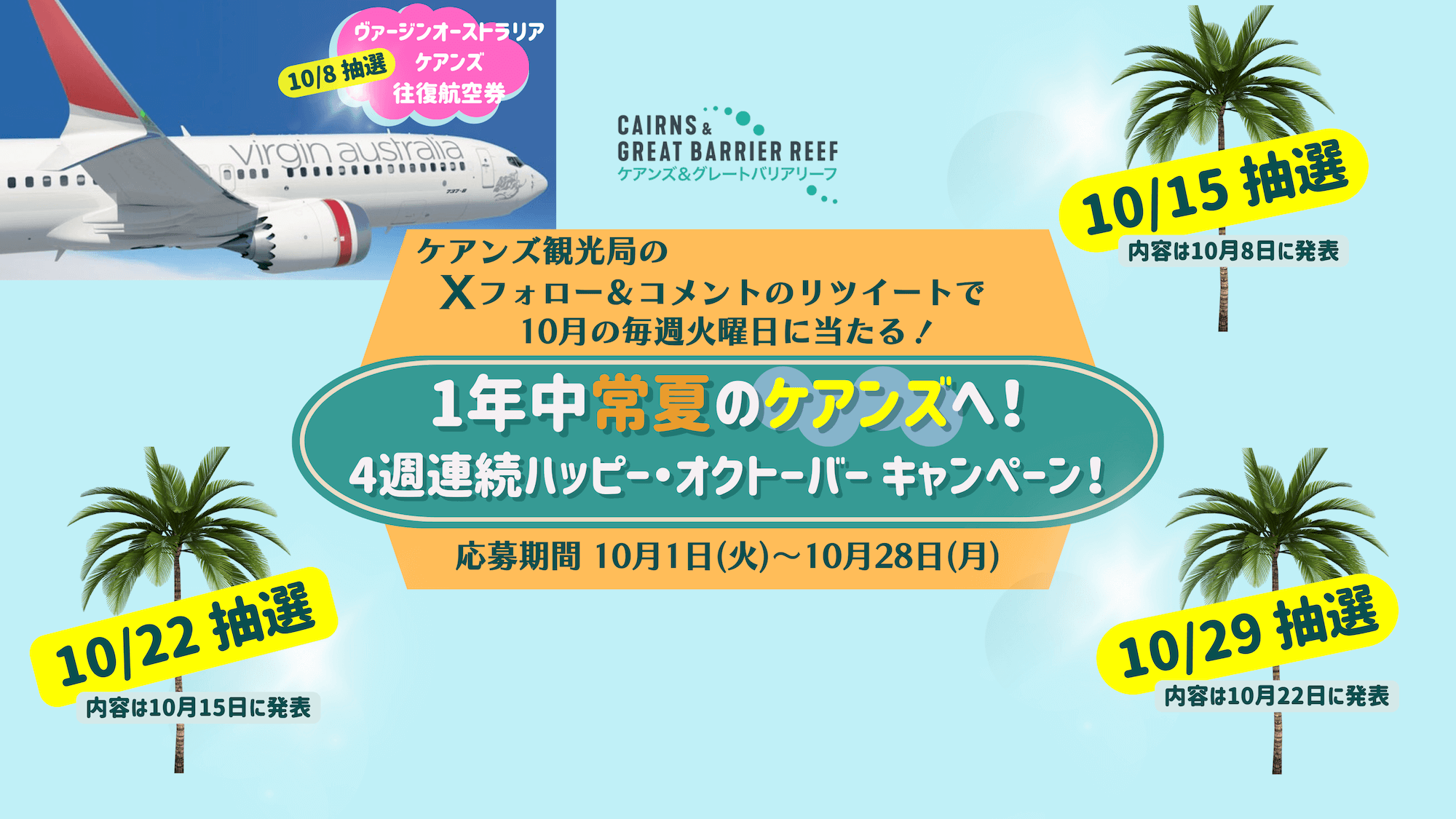 ケアンズ観光局(オーストラリア クイーンズランド州ケアンズ、CEO:マーク オルセン)は、2024年10月1日(火)から10月28日(月)までの4週間、 『1年中常夏のケアンズへ!4週連続ハッピー・オクトーバーキャンペーン!』をX(旧Twitter)で実施いたします。キャンペーン期間中、ケアンズ観光局の公式Xをフォローし、キャンペーン投稿に「ケアンズでやってみたいこと」をコメントしてリポストすると、日本―ケアンズの往復航空券や、ケアンズシティのホテル宿泊券を、毎週抽選で1組2名様に、4週連続で合計4組8名様にプレゼントします。