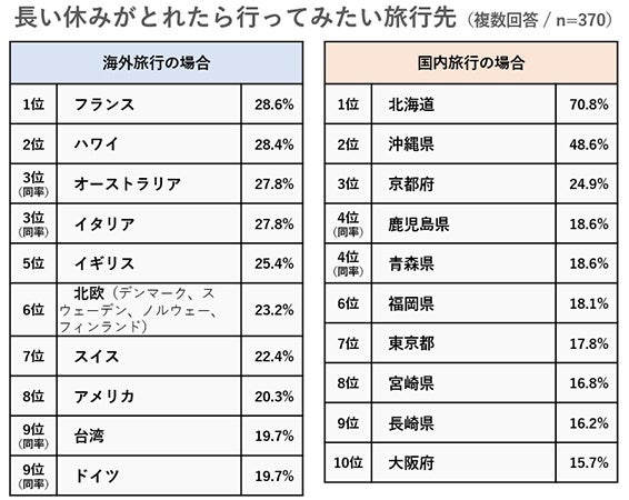 「とても行きたい」「行きたい」と答えた人を対象に、長い休みがとれたら行ってみたい海外旅行先の国と地域、国内旅行先の都道府県を選んでもらいました。