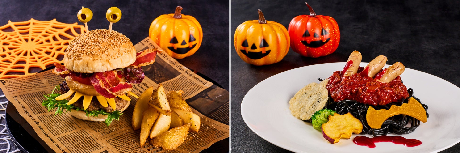 メインディッシュは、ジューシーな牛肉のパティにチーズやベーコンを合わせたボリューム満点の「モンスターバーガー」や、赤ワイン風味の赤いボロネーゼから指が出ている様子を表現した、少し不気味な「血みどろボロネーゼ」、竹炭で黒く色づけしたスパイス香るカレー「おばけライスと真っ黒キーマ」など、見た目にも楽しめるお料理を揃えます。
