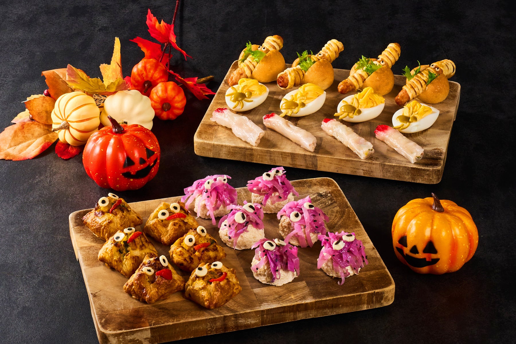 かぼちゃを食べちゃったサクっとおばけパイ・ピンクのモンスターシューマイ・マッシュポテトのライスペーパーフライ・はさまれちゃったミイラドッグ・スパイダーエッグ・本日のスープ・サラダ各種・パン各種・目玉ゼリー・ドーナツ など