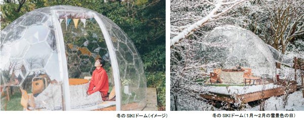「SIKIドーム」とは、まるで屋外にいるかのような気分を味わえる360度透明のドームです。当プランでは、1日2組限定でドームを貸切利用できます。特別メニューのお食事とともに冬景色の楽しめるプライベート空間で季節の移ろいをゆっくり味わえます。