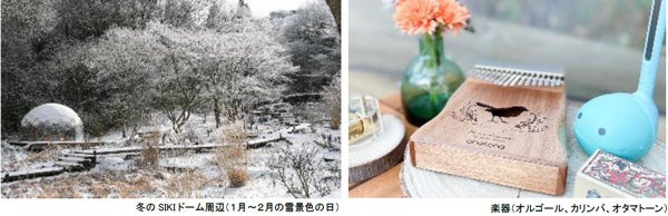こたつのあるSIKIドームを11:00から16:00まで1日2組限定で貸切利用できます。ドーム内から冬の「SIKIガーデン~音の散策路~」の風景を眺めたり、備え付けのオルゴールやカリンバ、オタマトーンなどの楽器の演奏体験やボードゲームや本を楽しんだりと、思い思いののんびりした時間が過ごせます。