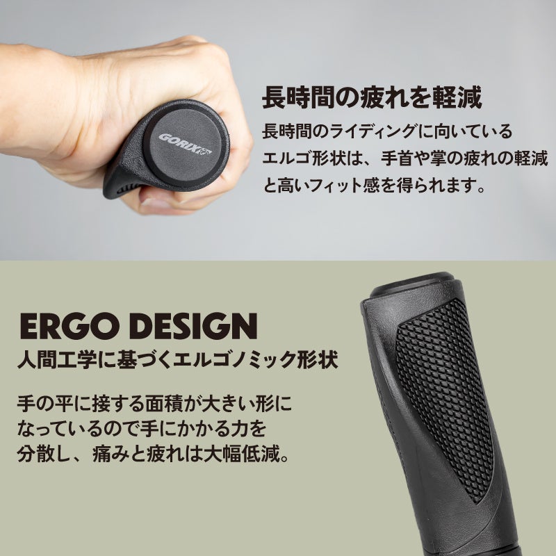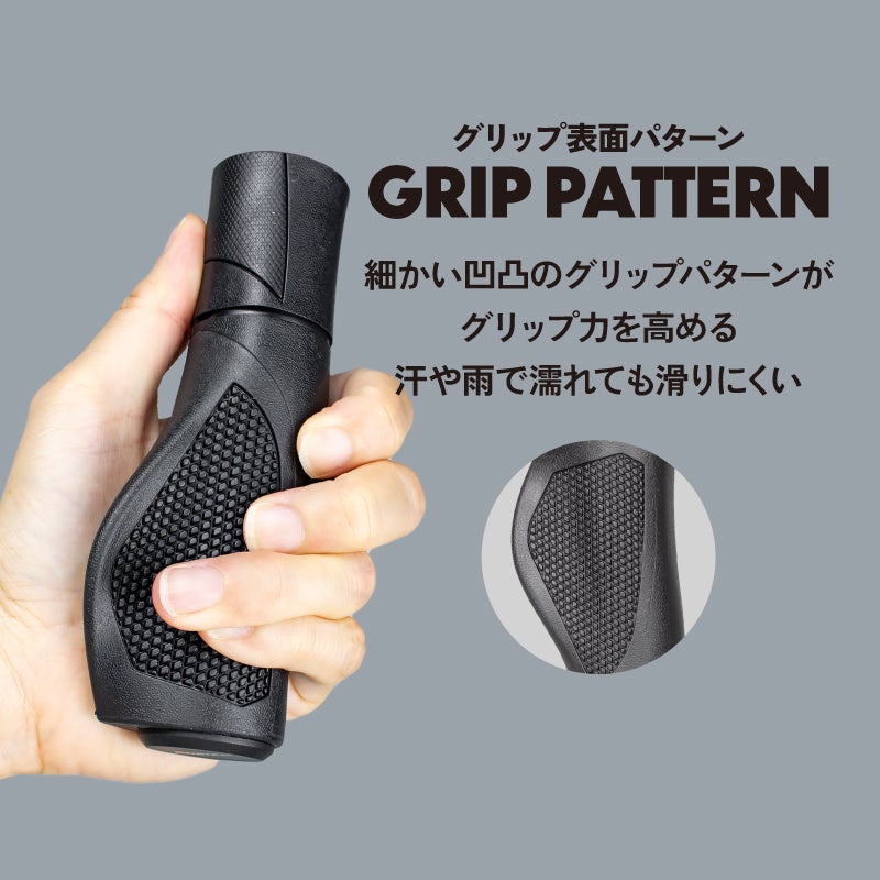 長時間のライディングに向いているエルゴ形状は、手首や掌の疲れの軽減と高いフィット感が期待できます。