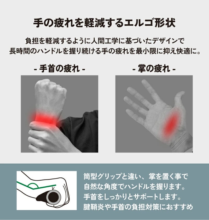 手の平に接する面積が大きい形になっているので手にかかる力を分散し、痛みと疲れは大幅低減します。