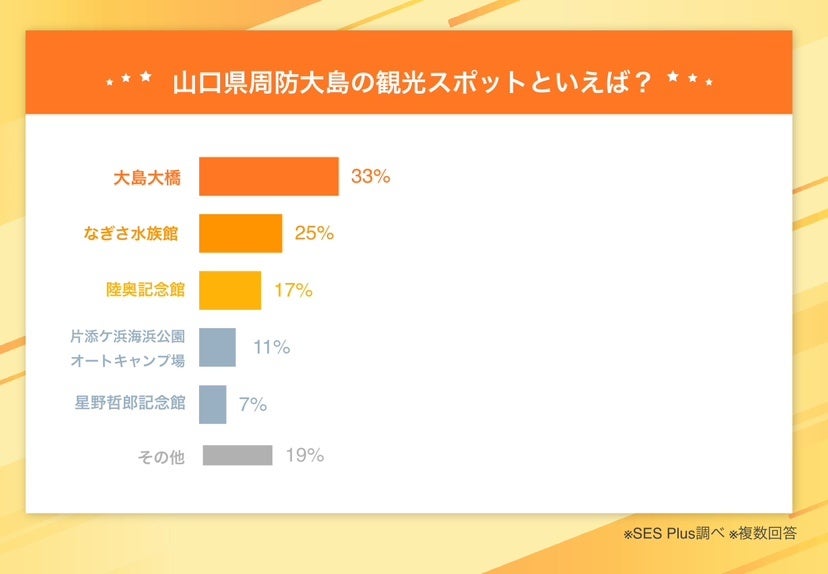 約156人の男女に「山口県周防大島の観光スポットといえば?」をアンケート調査したところ、1位「大島大橋(52票)」、2位「なぎさ水族館(39票)」、3位「陸奥記念館(28票)」という結果になりました。