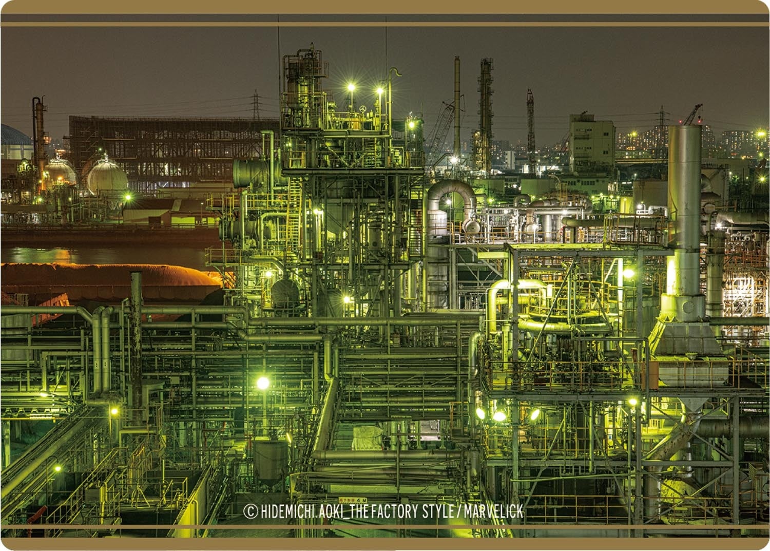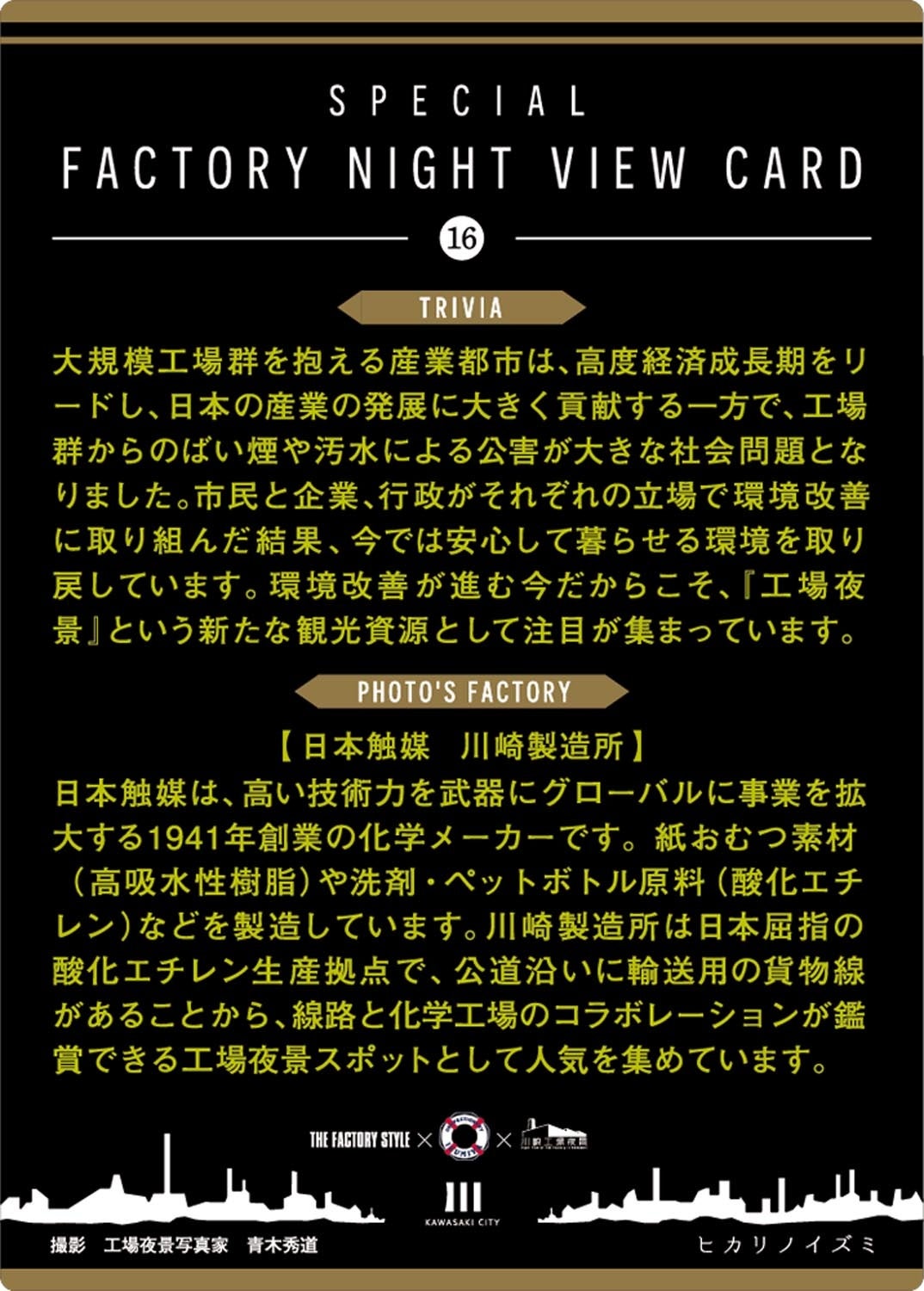 表面に工場夜景写真家・青木秀道氏の珠玉の写真を、裏面には工場夜景の歴史や秘話等が書かれたTRIVIAと表面写真の企業(工場)のアウトラインを、収めた「スペシャル工場夜景トレカ」(全10種)が、C-BOX・S-BOXともにランダムで1枚封入されています。