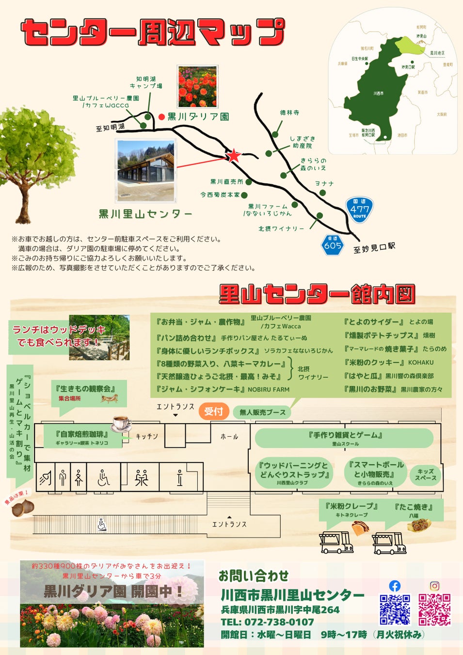 川西市黒川里山センターで秋のマルシェを開催。お弁当・パン・野菜などのおいしいお店と、自然工作・自然観察会などの体験コーナーがあります。黒川の名所、黒川ダリア園も開園中!子どもから大人まで楽しめます。