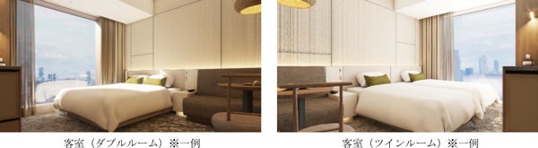 全482室の客室は、ダブルとツインによる構成とし、7~25階のスタンダードフロアと上層階26・27階のクラブフロアで計10タイプをご用意しています。安らぎを演出するため過度な装飾は行わず、室内はアースカラーを基調に、お客様が自然体でくつろげる居心地の良さを追求。また、天井から床までの大きな窓を採用した開放感あふれる空間で心身ともにリラックスしていただけます。