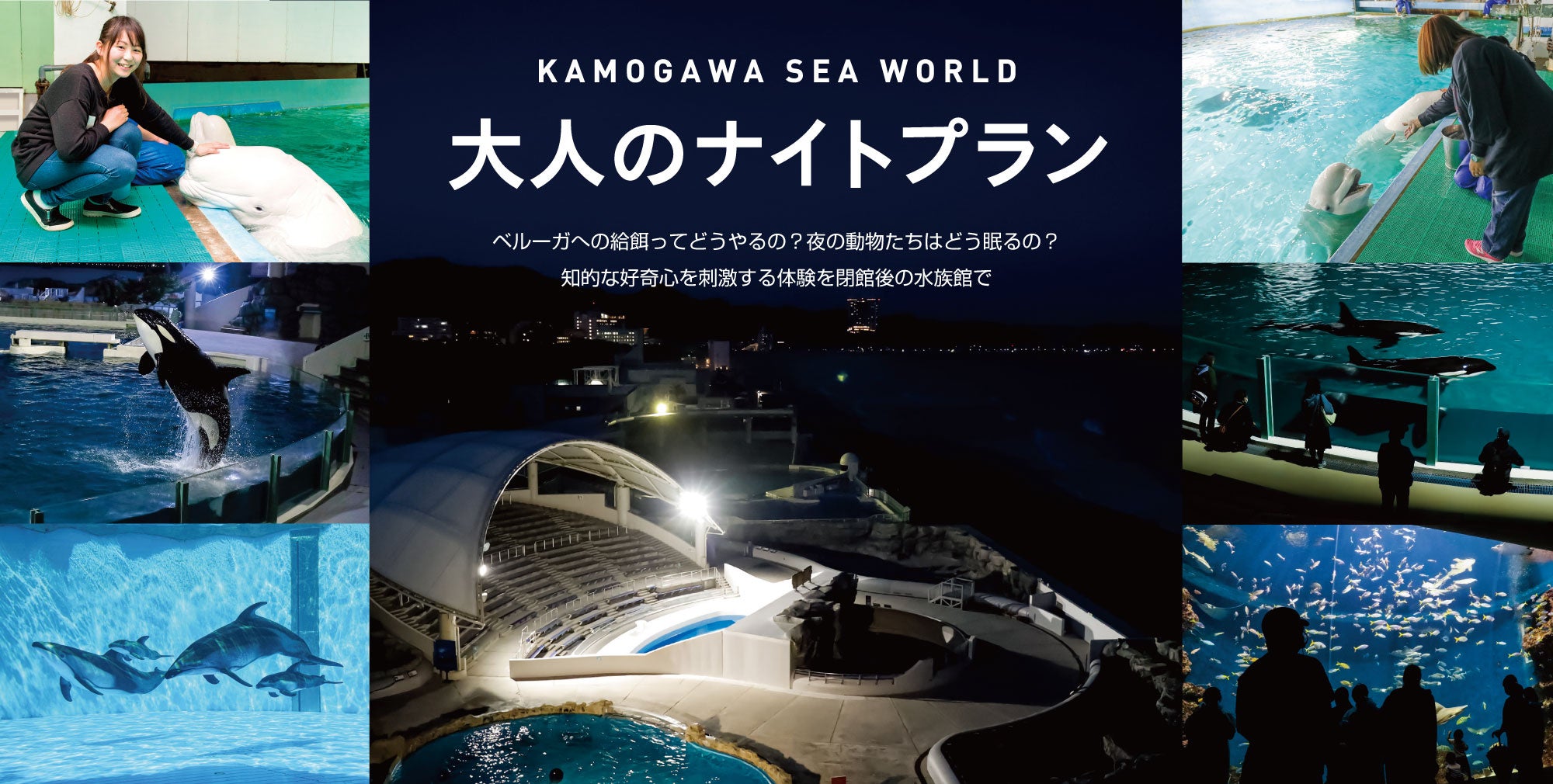 「大人のナイトプラン」は、閉館後の水族館を満喫する約4時間の特別企画です。ベルーガへのタッチや給餌・動かし体験をはじめ、プラン参加者と公式ホテル宿泊者のためだけに行われるシャチのナイトパフォーマンスを観覧することが可能です。動物たちとの時間を満喫したあとは、房総の食材を使用したディナーコースで会話を弾ませながら飼育員との会食をお楽しみください。プランの締めくくりは、静寂がおとずれた水族館を巡る「ナイトアドベンチャー」で、動物たちの寝姿を観察したあとメインゲートで解散となります。