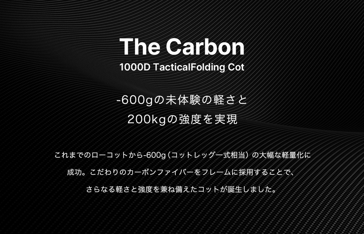 もちろんカーボンならではの高強度により耐荷重200kgを実現。見た目だけでなく中身でも従来品を凌駕するコットが誕生しました。