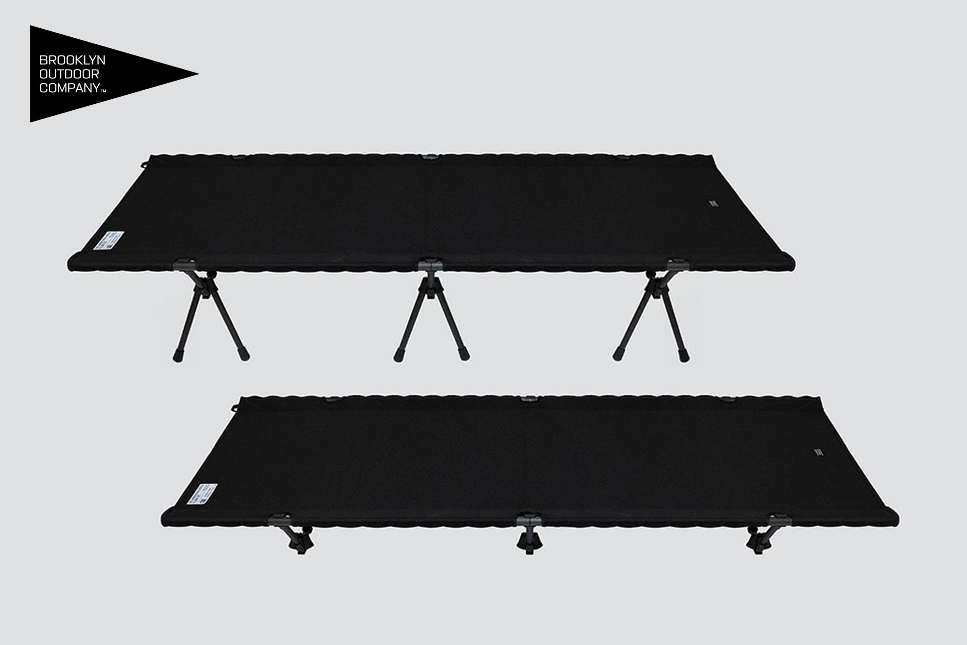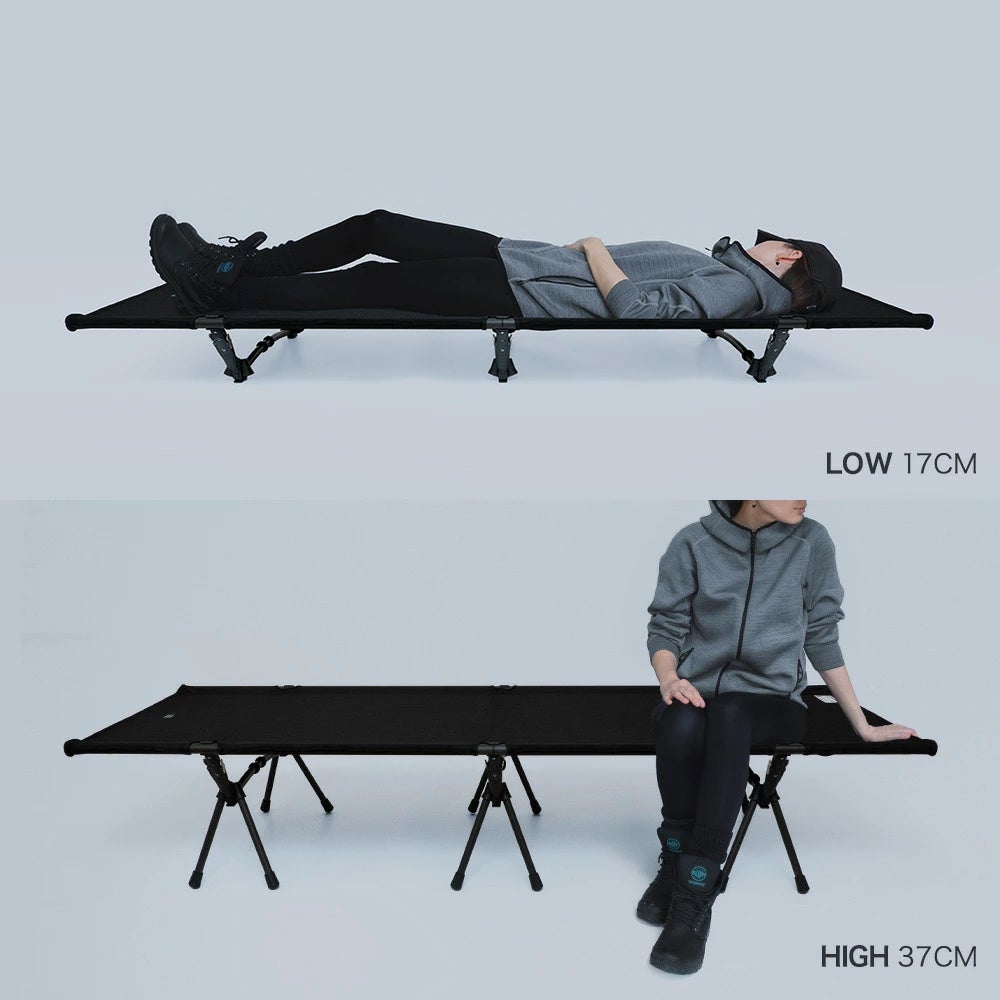 BROOKLYN OUTDOOR COMPANYのコットは付属のコットレグを使えば2WAYで17cmと37cmの高さの切り替えが出来るので、乗り降りの際の腰の負担を大幅に和らげてくれます。キャンプに限らず災害時等の長期に渡る避難生活でも一台あれば非常に安心。ベンチとして使用するにもベストな高さです。