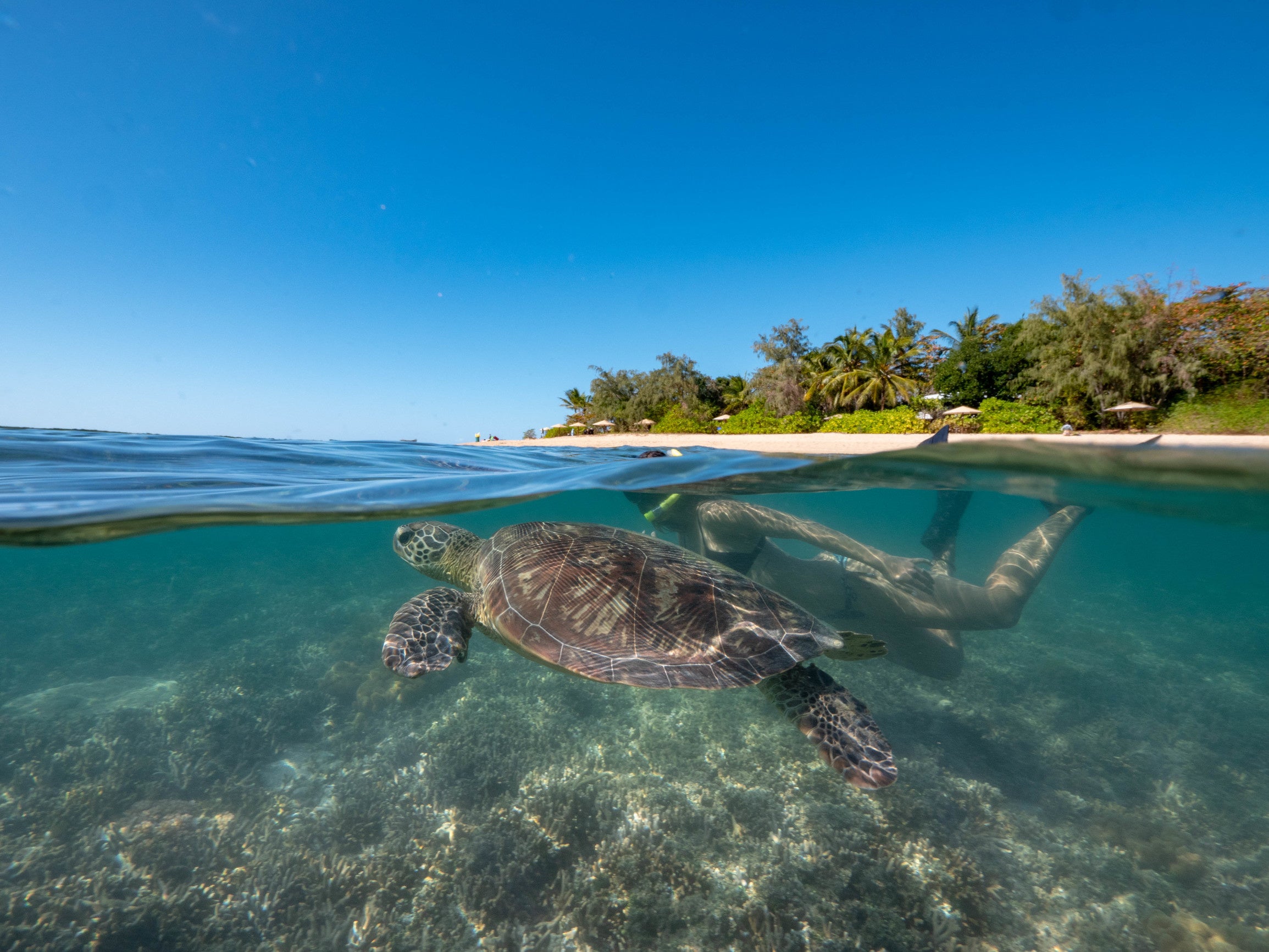 グリーン島の大きさは約12ヘクタール(東京ドーム約2.5個分)、まわりを歩いても30分程の小さな島ですが、サンゴ礁と熱帯雨林の2つの世界遺産があるとても特徴的な環境です。島内には、レストラン・ショップ・プール・有料コインローカー・更衣室などの設備が整っており、メインビーチにはライフガードもいるため家族連れで訪れても安心です。シュノーケリングは小さな魚を見ることができるだけでなく、運が良ければウミガメと一緒に泳ぐこともできます。