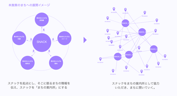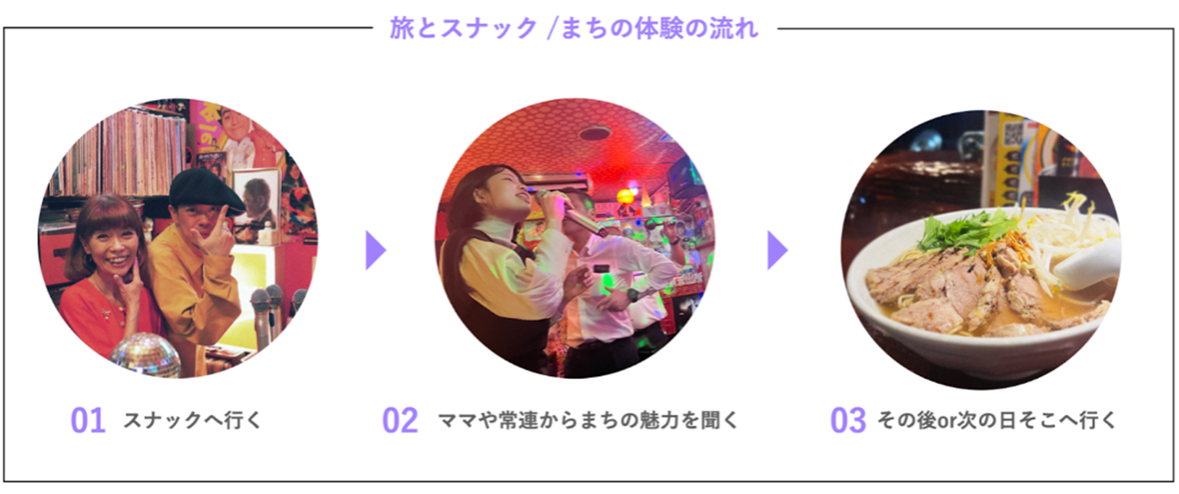 熊本市中央区には、カウンター越しに接客をする「スナック」が多く存在しており、スナックのママやマスター、常連さんはその地域の魅力ある場所を熟知しております。そこで、スナックを起点に旅をすることで、地元の方々との繋がりや交流を通じて、リアルな地域の魅力と出会い、旅の体験の更なる充実化を図ります。