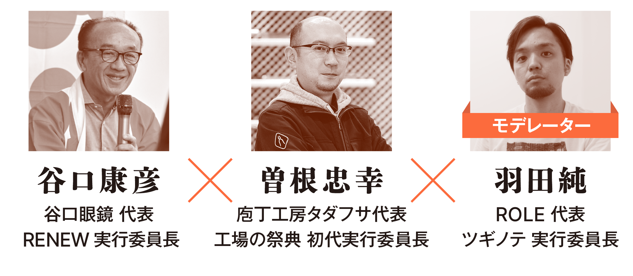 -登壇者:谷口眼鏡 代表、RENEW実行委員長 谷口康彦氏/庖丁工房タダフサ代表、工場の祭典 初代実行委員長 曽根忠幸氏