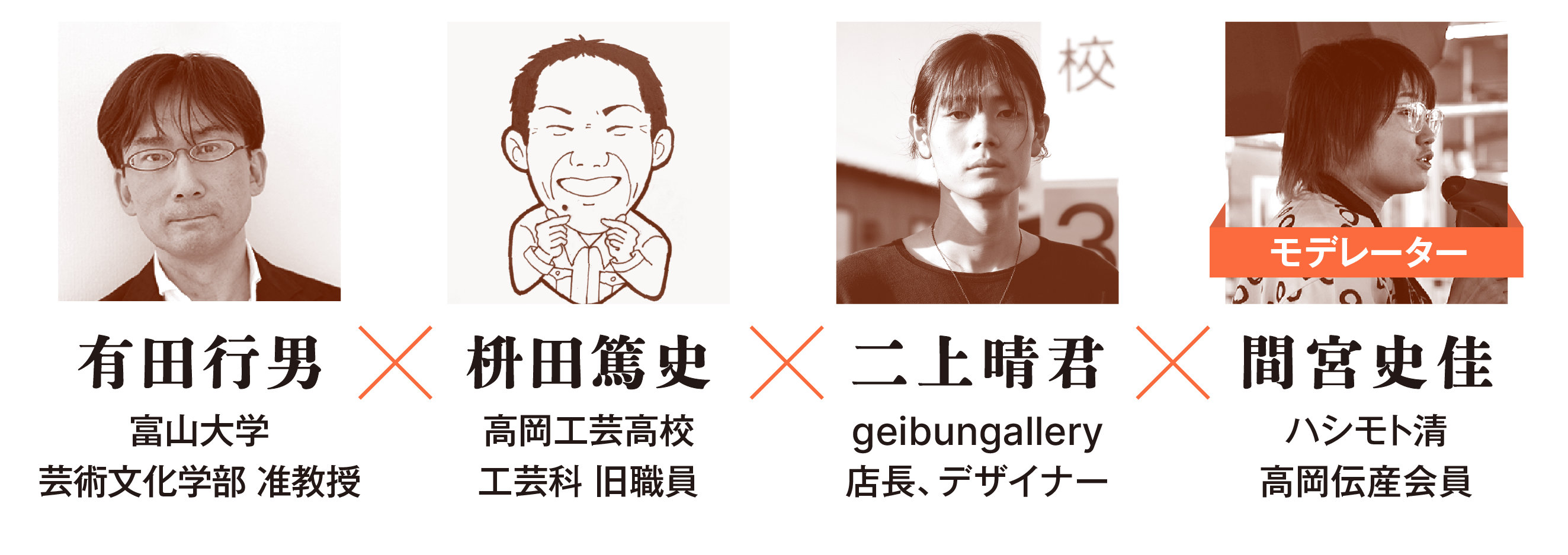 -登壇者:富山大学 芸術文化学部 准教授 有田行男氏/高岡工芸高校 工芸科 旧職員 枡田篤史氏/geibungallery店長、デザイナー 二上晴君氏