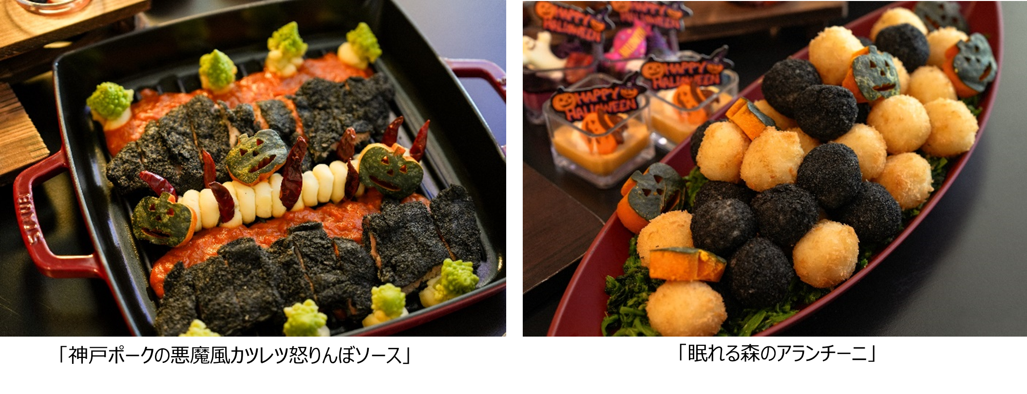 また、神戸須磨シーワールドに隣接する「神戸須磨シーワールドホテル」の「せとうちハーバーレストラン」では、地元神戸市で生産された神戸ポークの黒いカツにピリ辛のトマトソースを付けて食べる「神戸ポークの悪魔風カツレツ怒りんぼソース」や、秋の味覚キノコとかぼちゃを入れたリゾットにモッツァレラチーズを加え、外はサクサク、中はとろーりのライスコロッケ「眠れる森のアランチーニ」など、他にも地元の名産や神戸牛を使ったメニューがハロウィン仕様になって登場いたします。