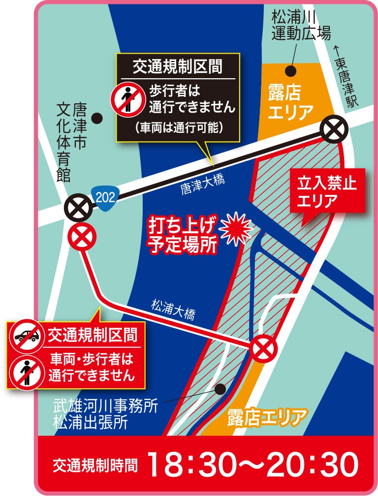 打上時刻は、午後7時30分から8時00分までです。 また、安全上の理由により周辺道路の交通規制を行います。