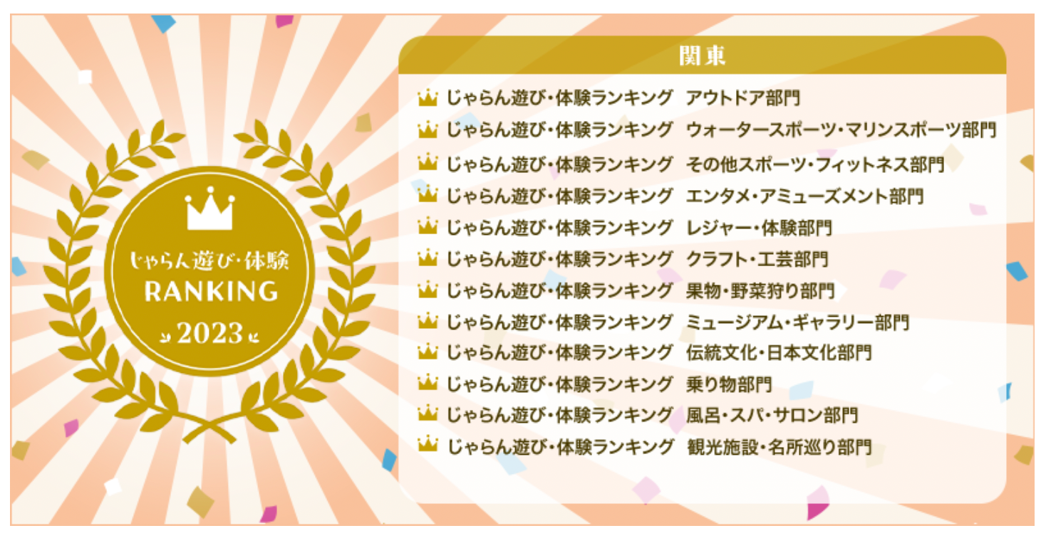 株式会社リクルート(本社:東京都千代田区、代表取締役社長:北村 吉弘、以下リクルート)が運営する旅行サイト『じゃらんnet』は、2023年(2023年1月~2023年12月)の1年間に多くのお客さまから支持された関東ブロックの遊び体験施設を表彰する「じゃらん遊び・体験ランキング」(関東ブロック)を発表致します。