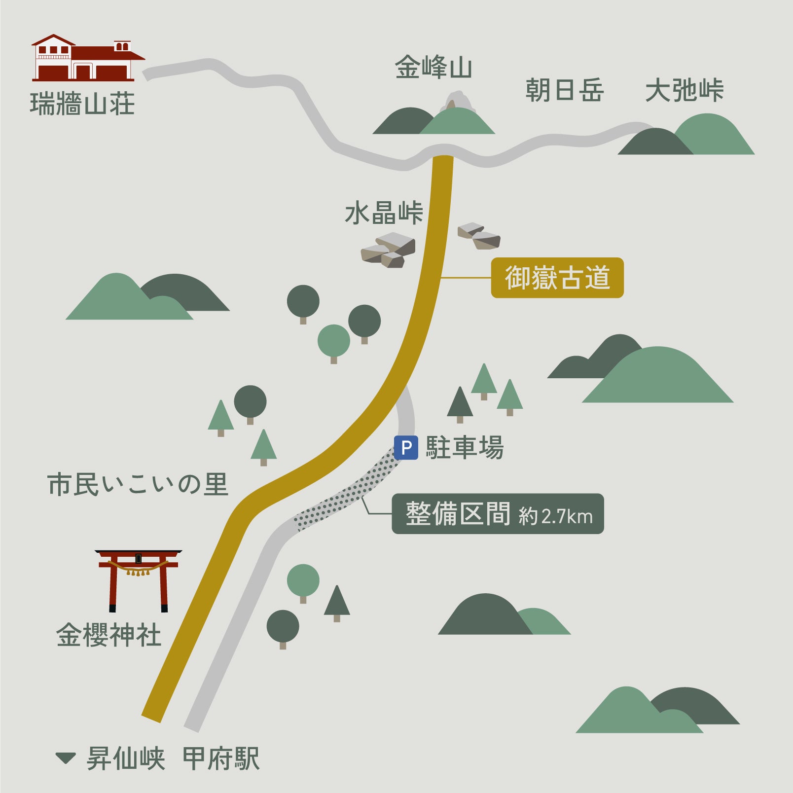 2023年12月に始めたクラウドファンディングで集まった資金にイーデザイン損保の支援なども加え、復活に必要な林道工事費を甲府市に寄付。2024年8月から工事が開始され、林道整備と駐車場整備が行われ金峰山古道の復活が実現されました。ぜひ、整備された駐車場を活用して金峰山の旧表参道である “御嶽道”を体験してみてください。