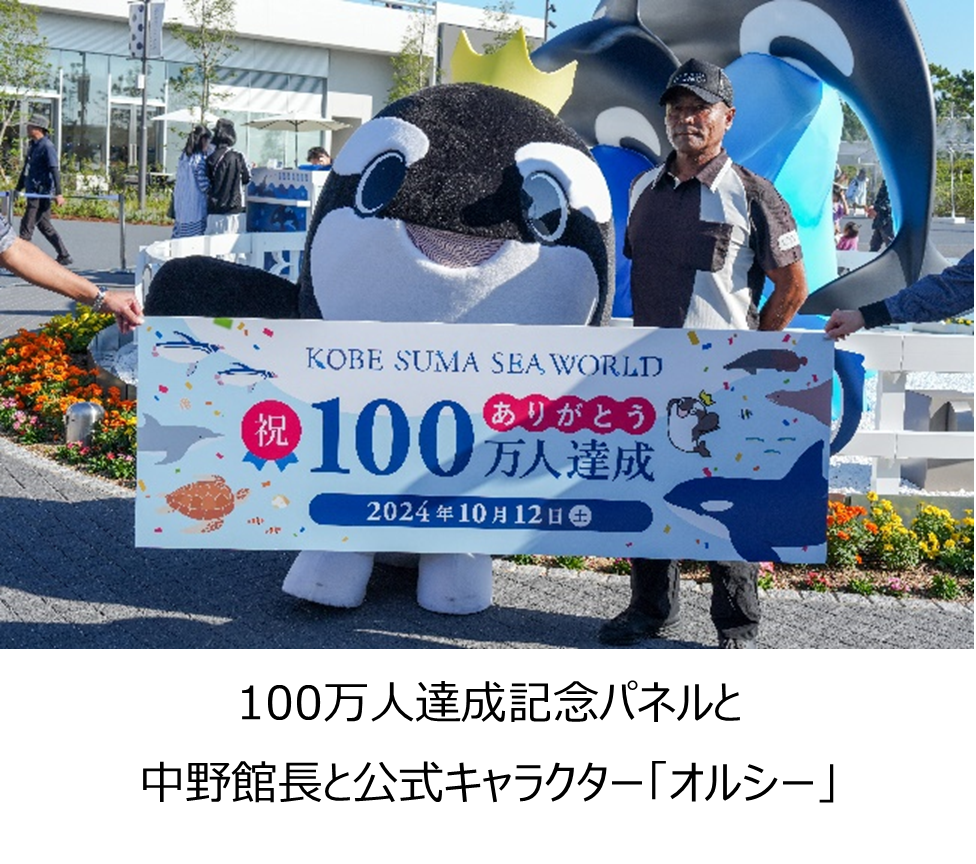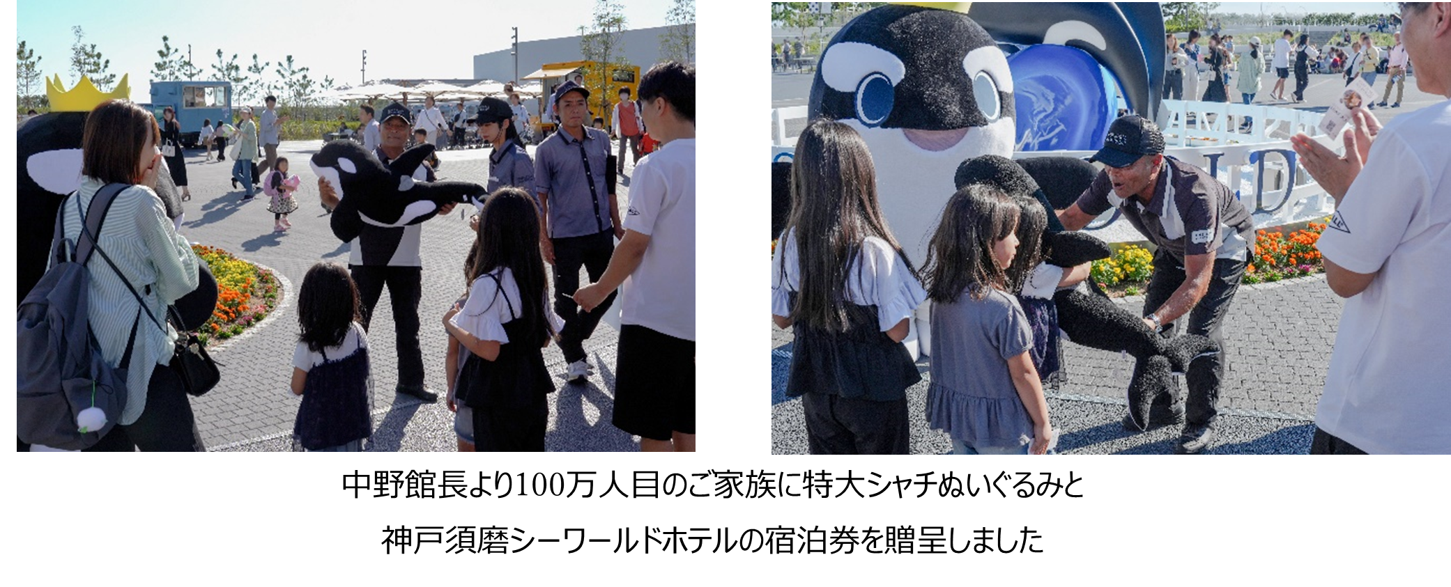 この度、開業から約4カ月経過した、10月12日(土)に来館者数が100万人を達成いたしました。当日は、100万人達成の記念として、館長と神戸須磨シーワールドの公式キャラクター「オルシー」から、100万人目のお客様に神戸須磨シーワールドホテルの宿泊券と、シャチの特大ぬいぐるみを贈呈いたしました。