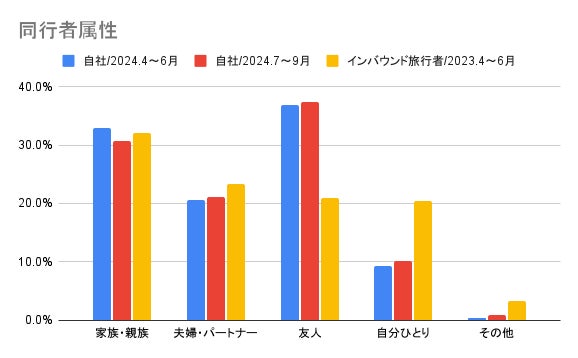 私たちの施設に宿泊したゲストに取ったアンケートとインバウンド旅行者*の同行者調査をグラフにしたものです。民泊を利用するゲストは、インバウンド旅行者全体の動きと比べ、友人と利用する割合が約10%多く、逆に自分ひとりでの利用は約10%少なくなっています。