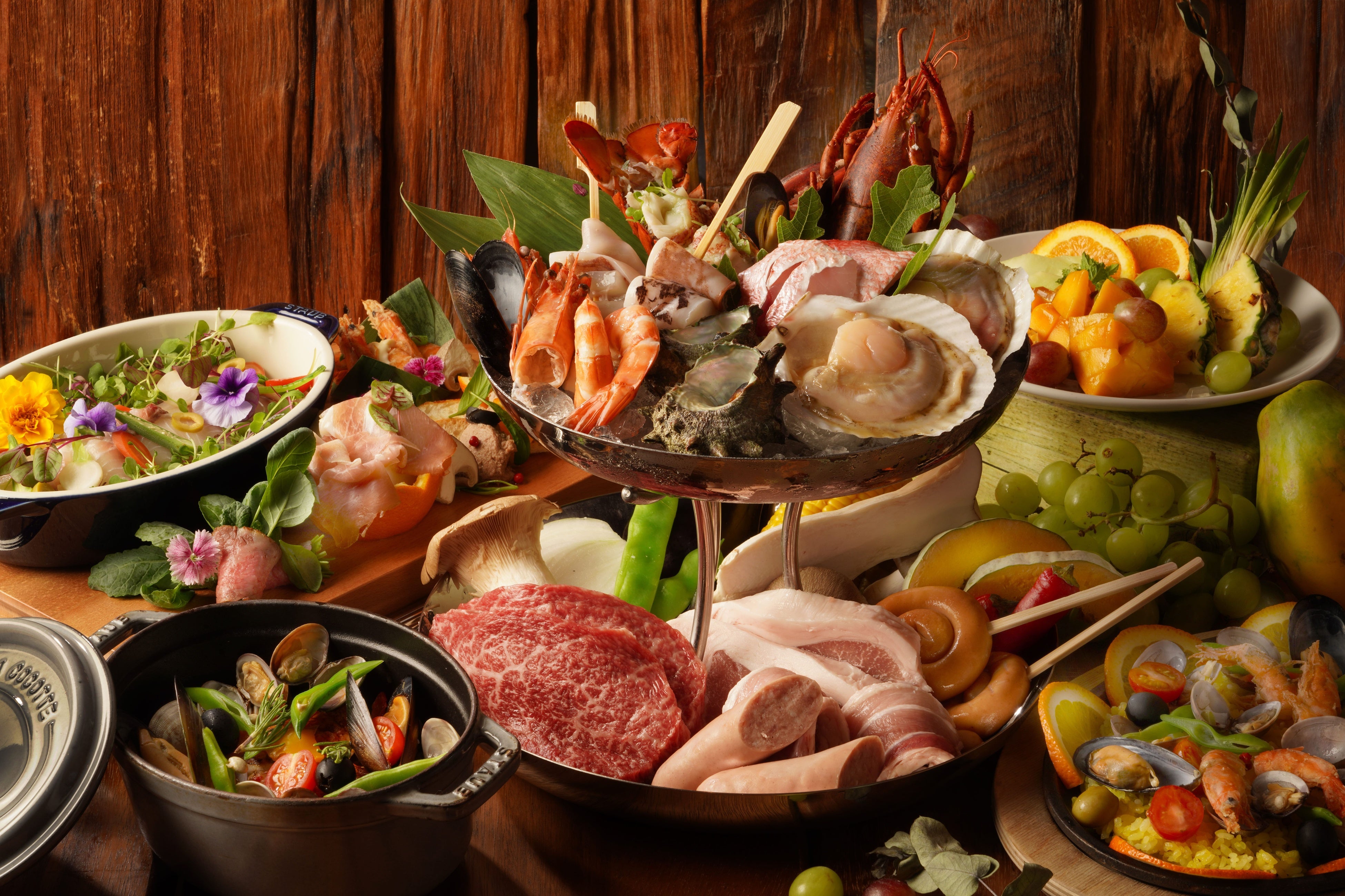 殻付きのホタテ貝・サザエ・赤足エビ・梅豚の他、ご注文のグレードに応じて、オマール海老や伊勢エビ・アワビ・丸鶏・トマホーク等の人気食材をBBQで。その他オードブルプラッターやパエリア、ココット鍋で仕上げたアクアパッツァなどサイドディッシュも充実させたコース仕立ての、『かなたのさと』の豪華ディナーをご用意いたします。