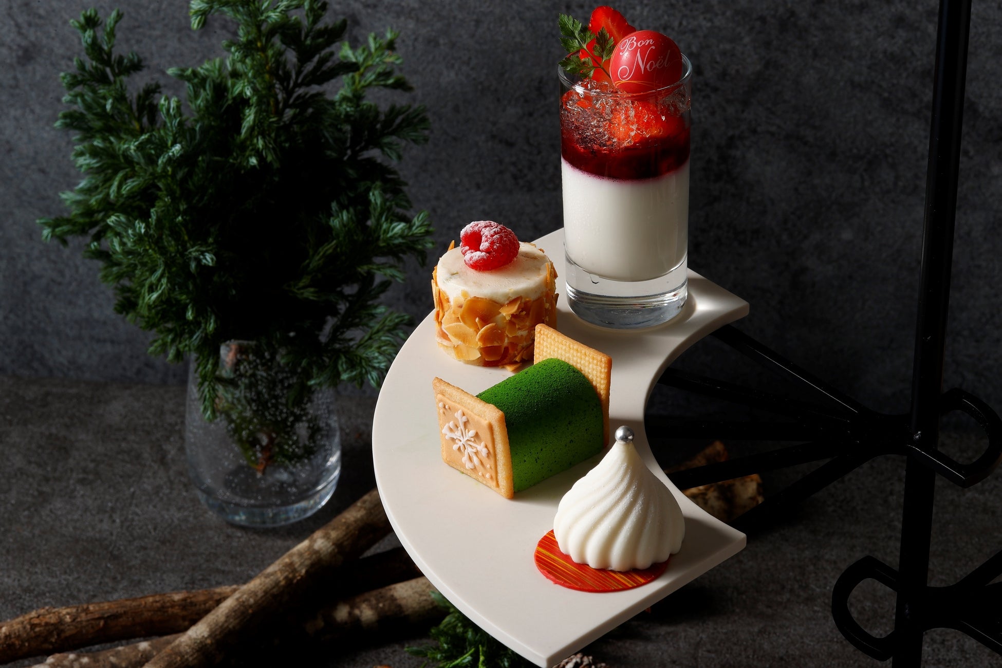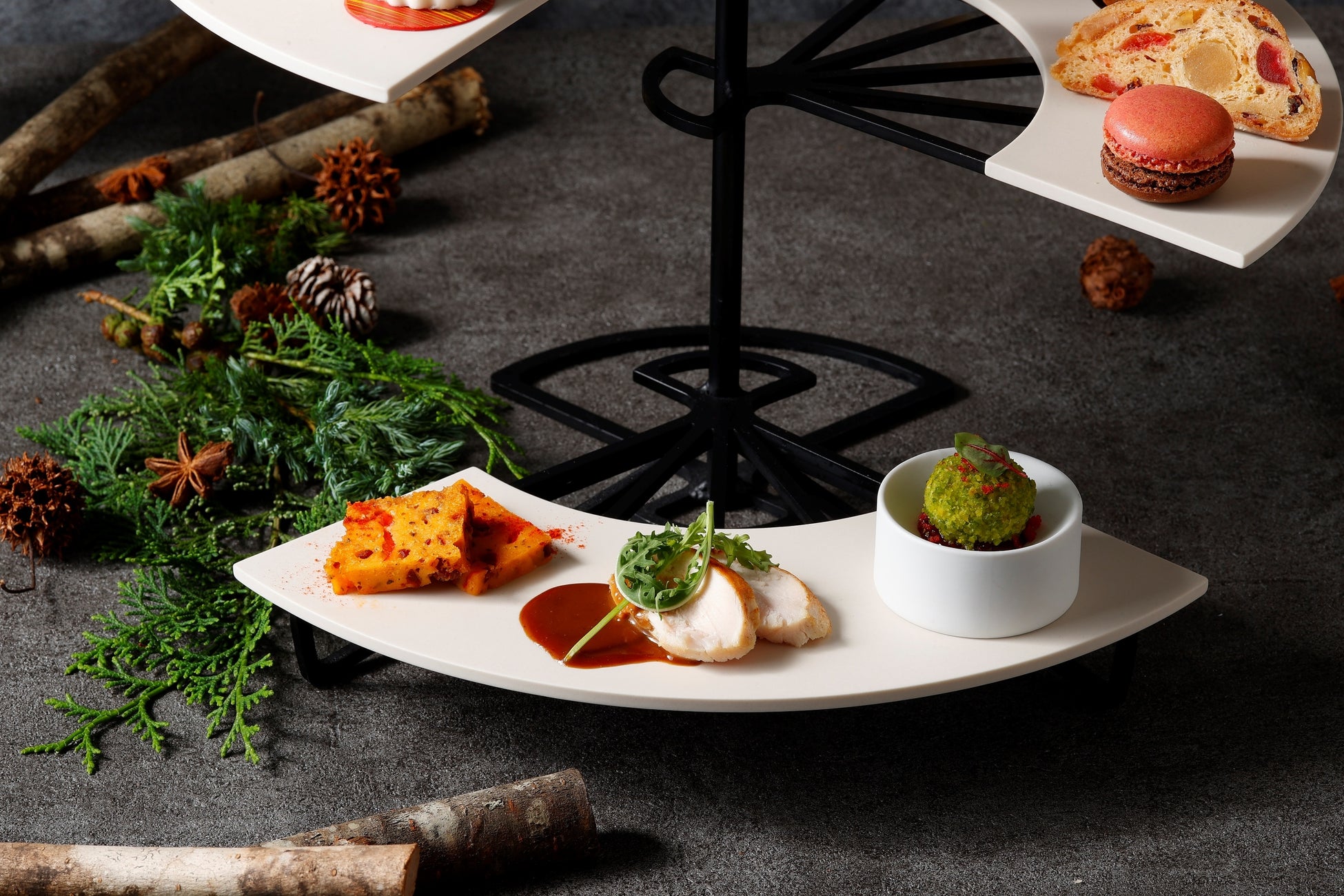 スイーツは、カカオ分66%のビターなチョコレートムースに、シナモンやナツメグなどスパイスたっぷりのビスキュイと繊細なチョコレートリングをあしらった「スパイシーなムースショコラ」や、ピスタチオのババロアを小さなブッシュドノエルに見立てた「ピスタチオのブッシュ」、はちみつのムースに6種のドライフルーツを混ぜ込み、食感のアクセントにアーモンドのヌガーをまぶした「ムースモンテリマール」など、心がほぐれるような味わいと、華やかな見た目の8品を、セイボリーは、クリスマスの定番料理「ローストチキン」や、ピスタチオをまとったフォアグラにいちごのソースの甘酸っぱさを添えた「フォアグラのムース」など3品をご用意し、扇形のティースタンドをオーナメントのように華やかに彩ります。
