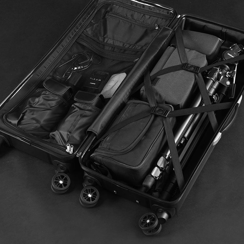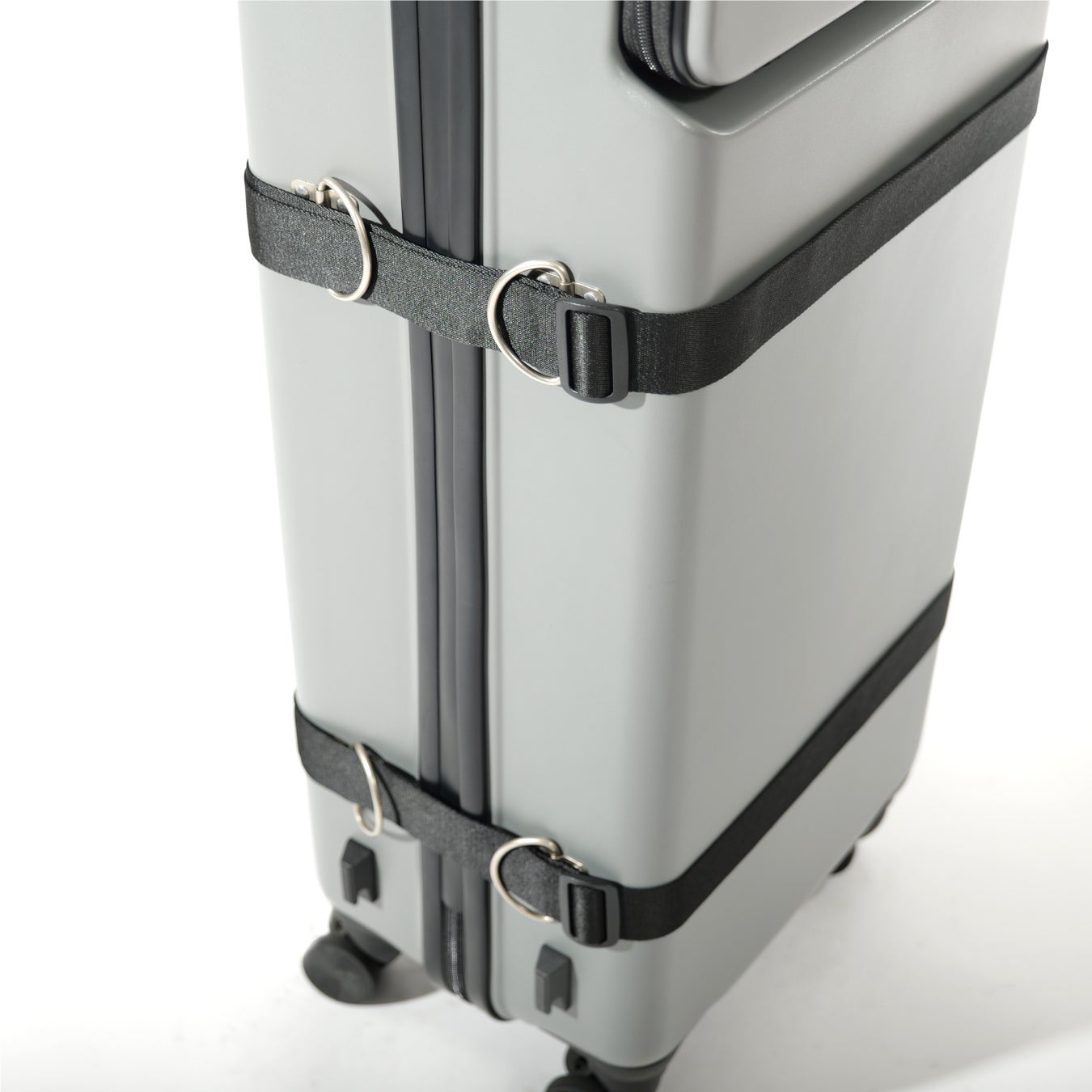 収納スペースを縦方向に確保した、内寸高さ79.5cmのロング仕様。カメラ三脚・アンブレラなどの撮影機材、タペストリーやA1ポスター、テニスラケット、1/3ドールなど、長くてかさばるアイテムをまとめて楽に運搬できます。さらに、スーツケース内に収まらない長尺物は、外側のDカンに市販のベルトを通して固定することが可能です。
