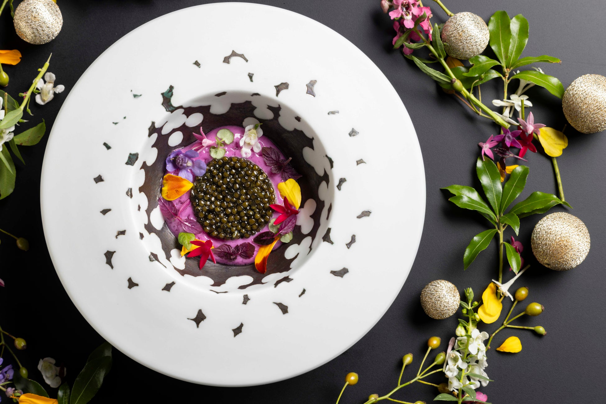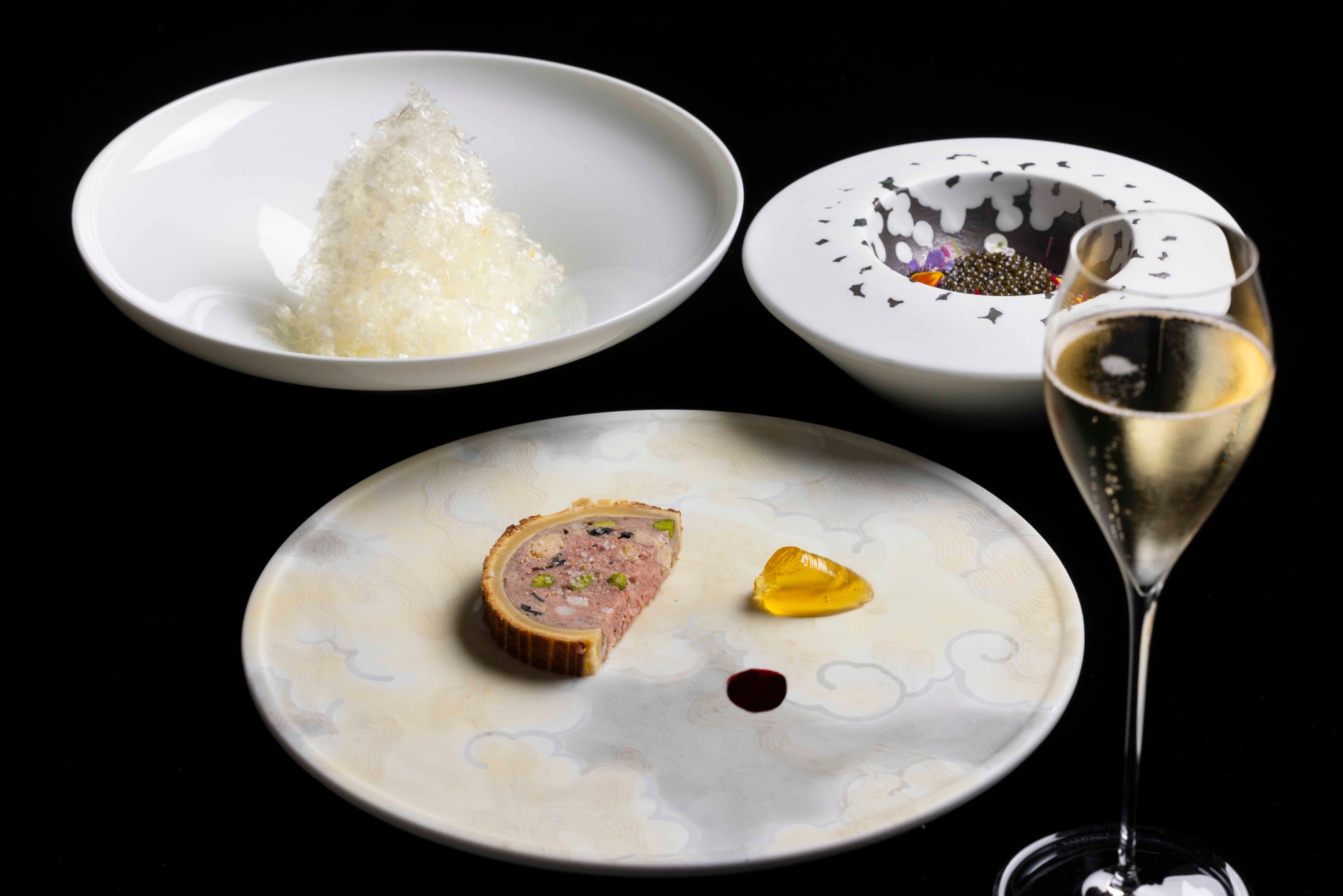 ディナーコースでは、クリスマスケーキを模したパテ・アンクルート「ブッシュドノエル・サレ」、北海道の毛ガニ、赤紫蘇や黒文字茶など日本の素材とキャビアを組み合わせたアミューズ、粉雪をイメージした飴細工で仕上げるデザートなど、ホリデーシーズンの煌めきを表現した一皿一皿をお楽しみいただけます。