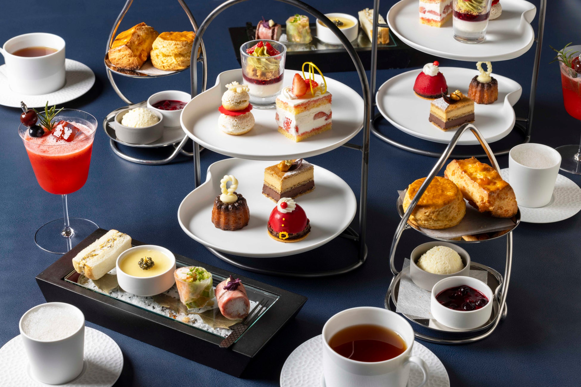 「クリスマスアフタヌーンティー」では、イチゴなどベリーを使ったシャンパンカクテル、酒粕カヌレ、サンタクロースモチーフのシトラスムース、スノーマン型のほうじ茶ルリジューズなどクリスマスのモチーフを散りばめたスイーツとセイボリーを、こだわりのドリンクメニューとともにお楽しみいただけます。都心を一望する空間で、親しい方と贅沢な午後の時間をお過ごしください。