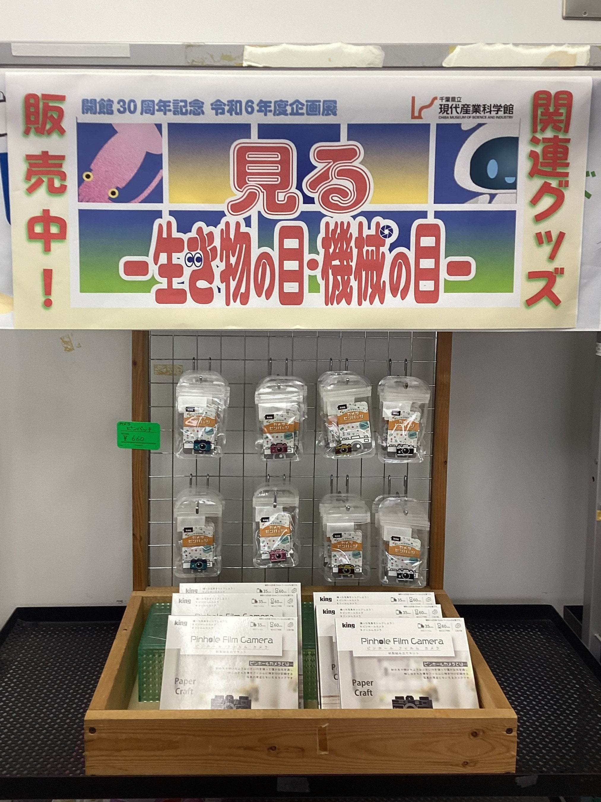 ミュージアムショップでは、「見る」に関連するピンバッチやピンホールカメラ等が販売されています。(営業日予定:土曜日・日曜日・祝日 13:00~16:30)※都合により実施しない日もあります。