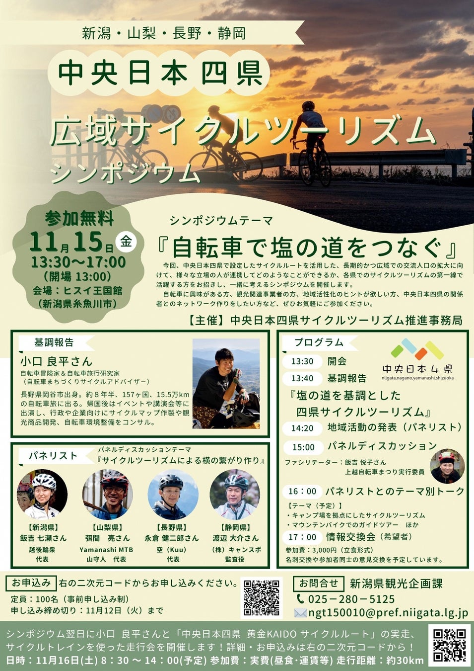 自転車に興味がある方、観光関連事業者の方、地域活性化のヒントが欲しい方、中央日本四県の関係者とのネットワーク作りをしたい方 等