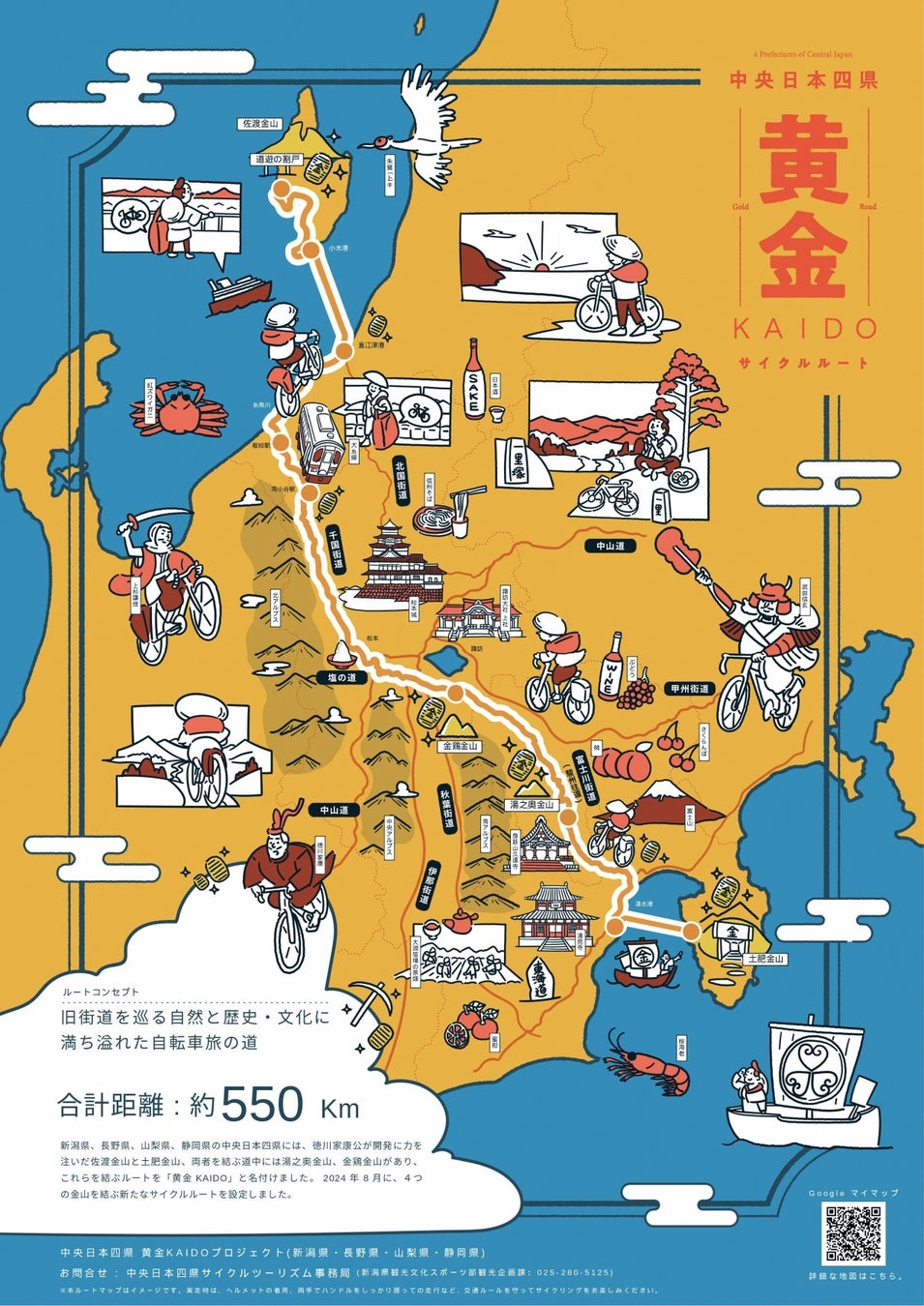 中央日本四県(新潟・山梨・長野・静岡)では、広域での観光周遊を促進するため、各県にある金山に着目した「黄金KAIDOプロジェクト」の一環として、今年9月に佐渡金山(新潟県)と土肥金山(静岡県)を結ぶサイクルルートを設定しました。