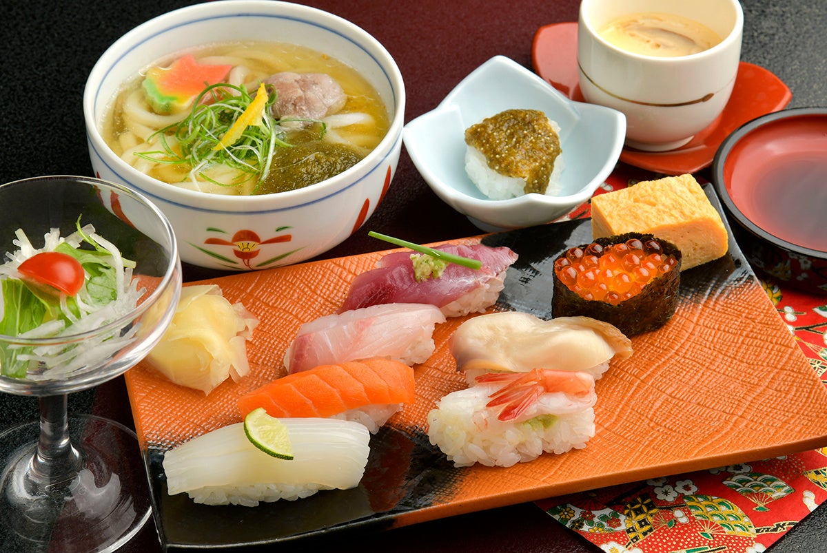 東京で腕を磨いた職人の店主が握る、鮮度抜群の寿司が好評なお店。人気のランチは地元の海産物を中心とした寿司、ハーフうどん、茶わん蒸し、サラダなどがついており、遠くからでもわざわざ行く価値アリの満足セット。そのとき旬のネタが日替わりで楽しめるのも魅力です。うなぎ料理にも定評があり、ランチでは「うな丼セット」(1980円)も提供しています。