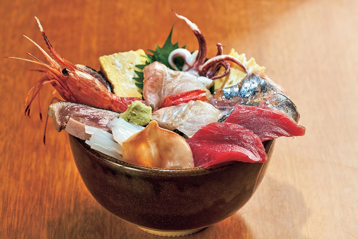 大将が一人で切り盛りする、地元民に愛される居酒屋。ランチの有名メニューは海鮮丼で、豪快に盛られるネタ数と大振りな切り身が人気の理由です。仕入れにより変動するものの、生マグロ、イカ、エビ、白身、貝、タコ、アジ、サーモン、玉子などが楽しめます。ランチはほかに、「旬の刺身定食」(1400円)や「白身魚とマグロの漬け丼」(1300円)など5種類です。