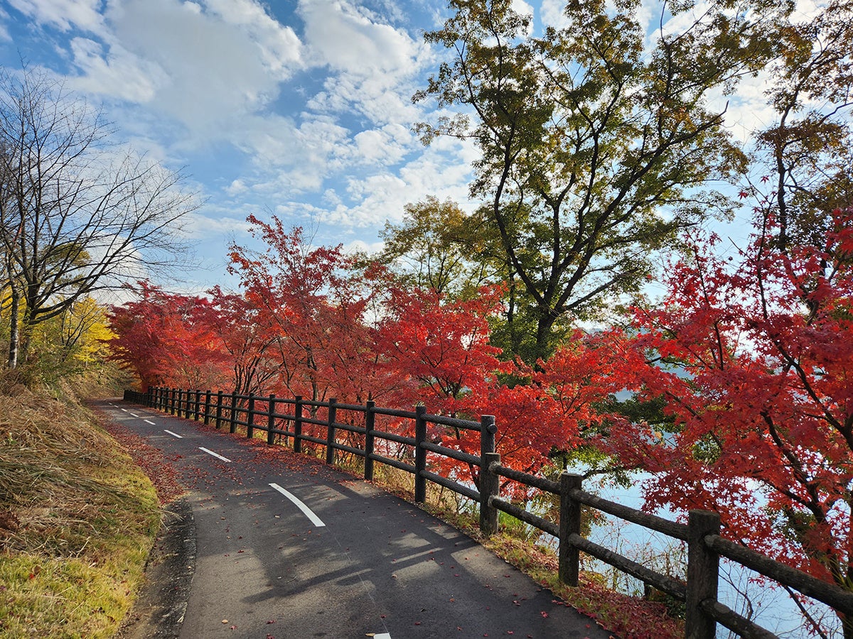 佐賀県の北山湖に広がる自然公園では、 1周約6 kmのコースをレンタサイクルで疾走しながら、湖と紅葉のコラボ絶景が観賞できます。ピーク時はモミジの赤とイチョウの黄色い紅葉グラデーションがあちこちに出現し、どこを見ても絶景です。