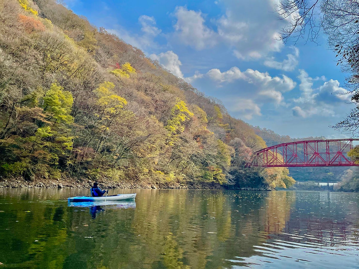 全長約18kmの雄大な峡谷「帝釈峡」は、切り立った崖に囲まれる広大な神龍湖が見どころ。周囲の遊歩道から湖面に映るモミジやイチョウが堪能でき、色づく木々と真っ赤な橋とのコントラストも美しいスポットです。神龍湖上流へ往復約90分のカヤック体験では、湖面が穏やかなため、自然の音を聞きながらゆったり満喫できます。