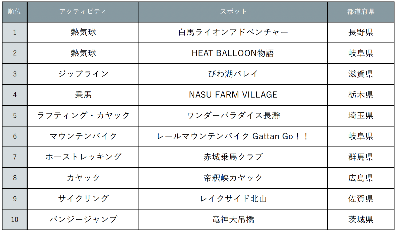 いよいよ紅葉シーズンの到来。各地の名所や自然豊かな風景がだんだんと赤色に染まる様子は、秋ならではの絶景です。今回は美しい絶景をただ眺めるだけでなく、アクティブに楽しむことができる「アクティビティ紅葉」をテーマにアンケートを実施しました。体験してみたいアクティビティ紅葉1位を獲得したのは、長野県の「熱気球(白馬ライオンアドベンチャー)」でした。タイミングがよければ上空から雲海が見られることもあるそう。これからの時期は雪と紅葉のコラボ絶景も見どころです。続く2位には岐阜県で体験できる「熱気球(HEAT BALLOON物語)」がランクイン。郡上の雄大な景色を大パノラマで堪能できる点が魅力です。そして3位は滋賀県の「ジップライン(びわ湖バレイ)」で、琵琶湖を眺めながら紅葉も同時に楽しめる開放感抜群のスポットです。そのほかトップ10には、乗馬やカヤック、サイクリングからバンジージャンプまで多彩なアクティビティと一緒に紅葉観賞ができるスポットが並ぶ結果となりました。ゆったりと眺める紅葉もステキですが、時には絶景に包み込まれるような体験とともに、アクティブな紅葉狩りで新しい楽しみ方を見つけてみませんか。