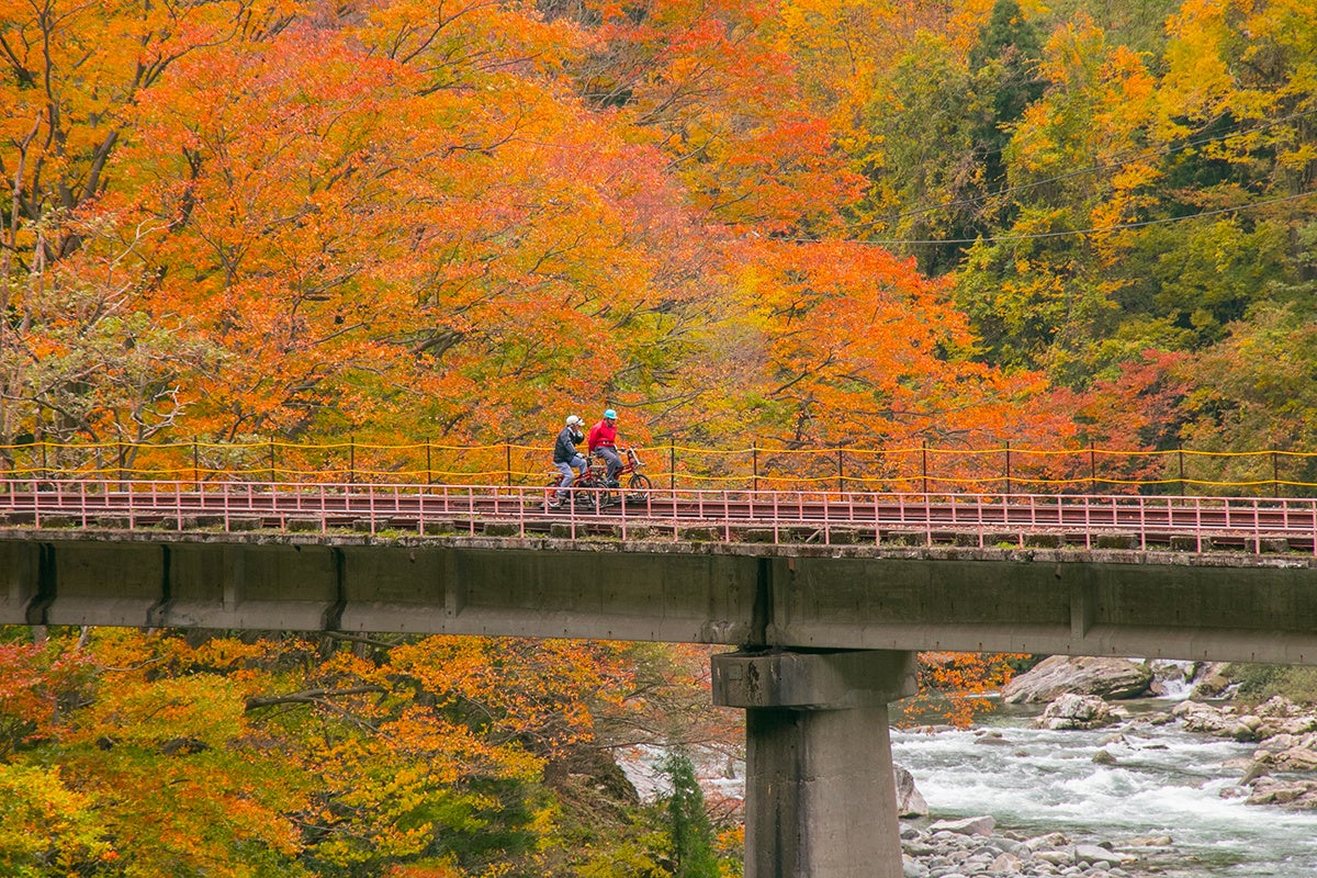 廃線レールの上を自転車で駆け抜ける新感覚アクティビティ。スリルを味わいながら紅葉を楽しむなら「渓谷コース」がおすすめです。往復約70分のコースは、鉄橋あり、トンネルありのワイルドなコース展開で、見上げても見下ろしても絶景が広がる没入感が見どころ。往路で見逃した景色を復路でもう一度見られるのも魅力です。漕ぎながら写真撮影も可能です。