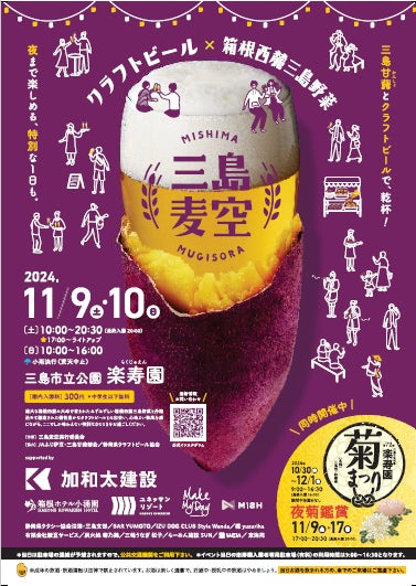 三島麦空実行委員会主催、三島甘藷とクラフトビールの祭典を、2024年11月9日(土)、10日(日)三島市立公園楽寿園で開催いたします。