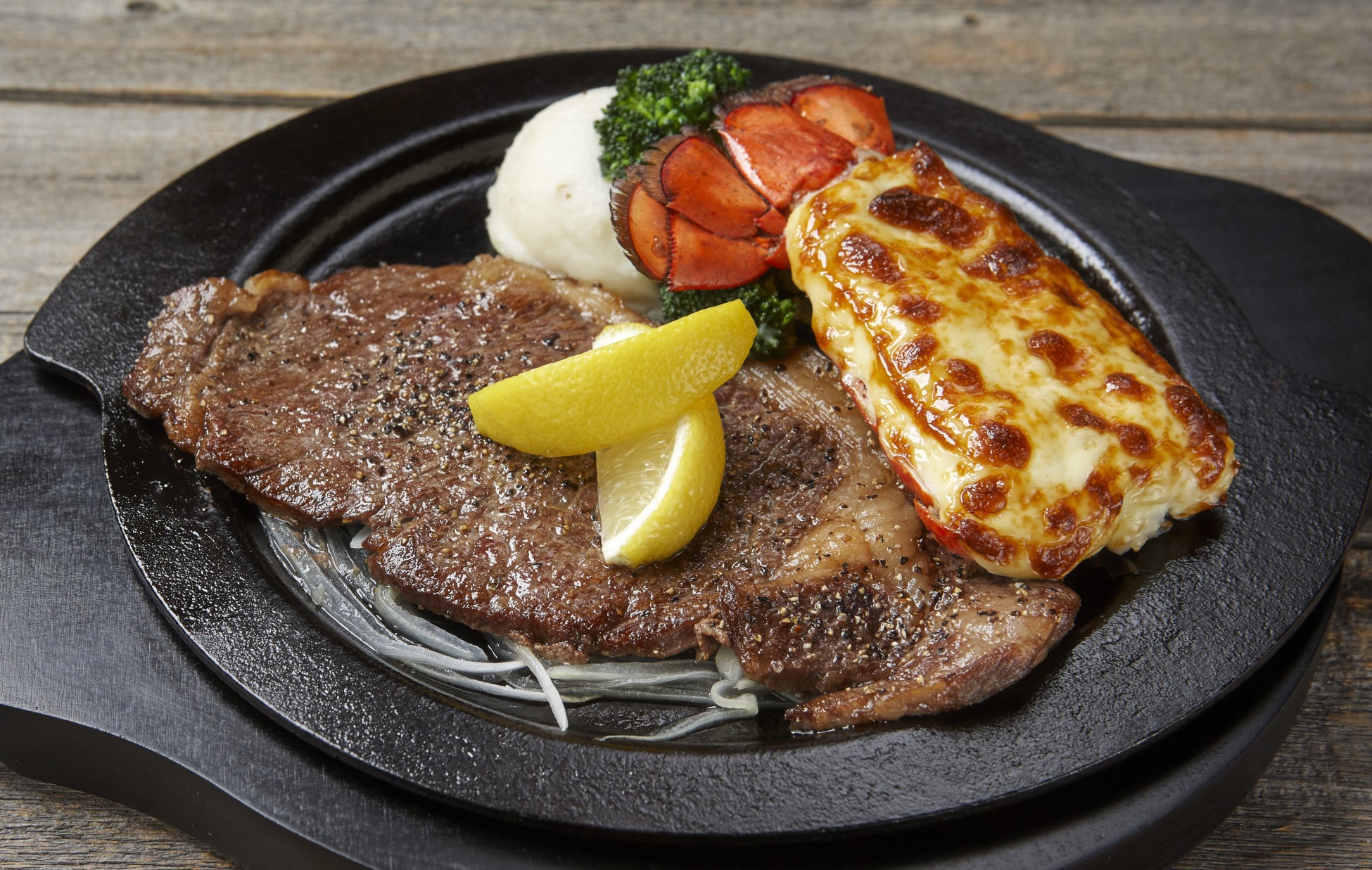 佐世保発祥のレモンステーキを黒毛和牛のサーロインで。レッドロブスターで長年愛され続ける「ロブスターの黄金焼き」と組み合わせた贅沢な一品です。