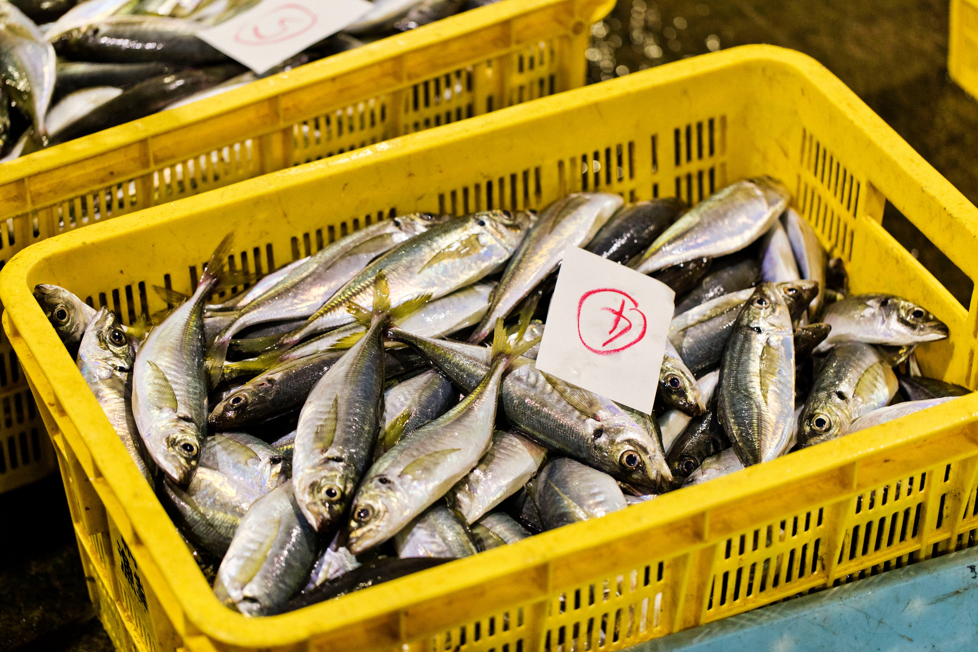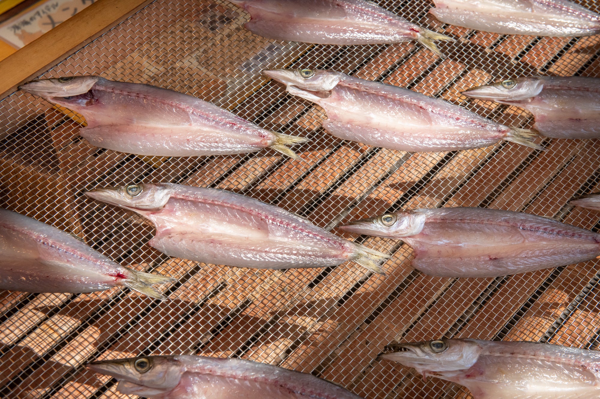 魚と塩のみで作られるひものは、その素材の質がとても重要。市場で競られたその日の魚は輝くほど美しい。刺身になる鮮度で作られるひものは数少ない。本来の前浜で水揚げした魚では、安定した生産はできなく、大きい工場であれば、材料は冷凍魚となる。その違いは仕上がったひものの姿にあわられる。