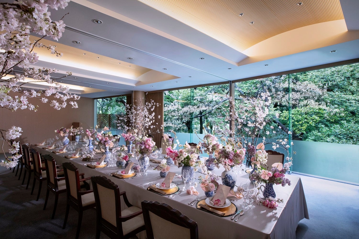 明治神宮の豊かな緑と、テーブルコーディネートが溶け込む「フォレストテラス明治神宮」の披露宴会場。少人数会食から盛大なご披露宴まで、検討人数やスタイルに合わせてご提案いたします。