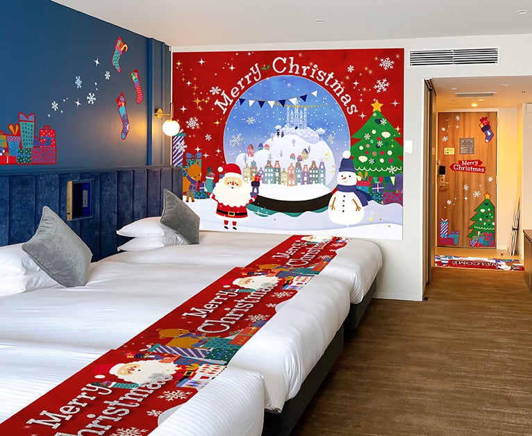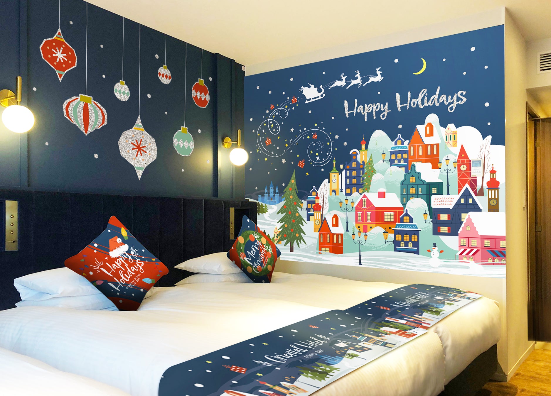 きらめく雪が舞い降りる聖夜の街をテーマに2種類のデザインで展開するコンセプトルームは、壁面やテーブル、ベッドスローやクッション、洗面室内など、お部屋の随所にクリスマス装飾をちりばめてお出迎えします。また客室内にツリーも設置し、クリスマスらしい空間を演出します。