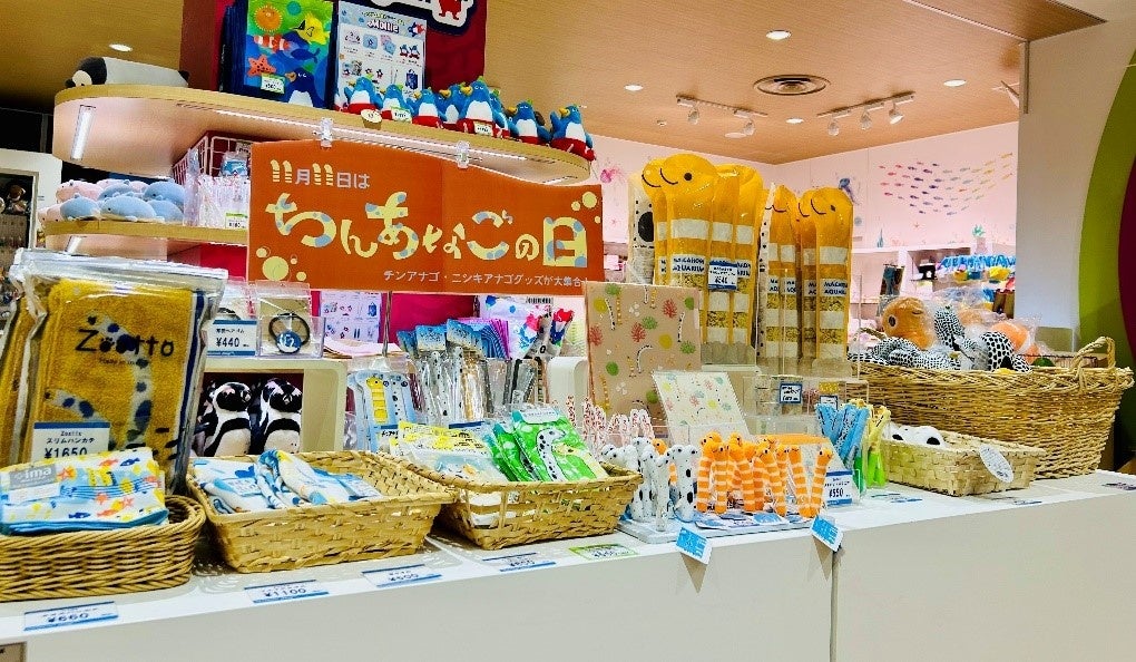 ミュージアムショップ「umimori shop」では、チンアナゴ特設コーナーを設け、チンアナゴのユーモアたっぷりなグッズを多数ご用意しております。文房具など、お気に入りを見つけてみてはいかが!?