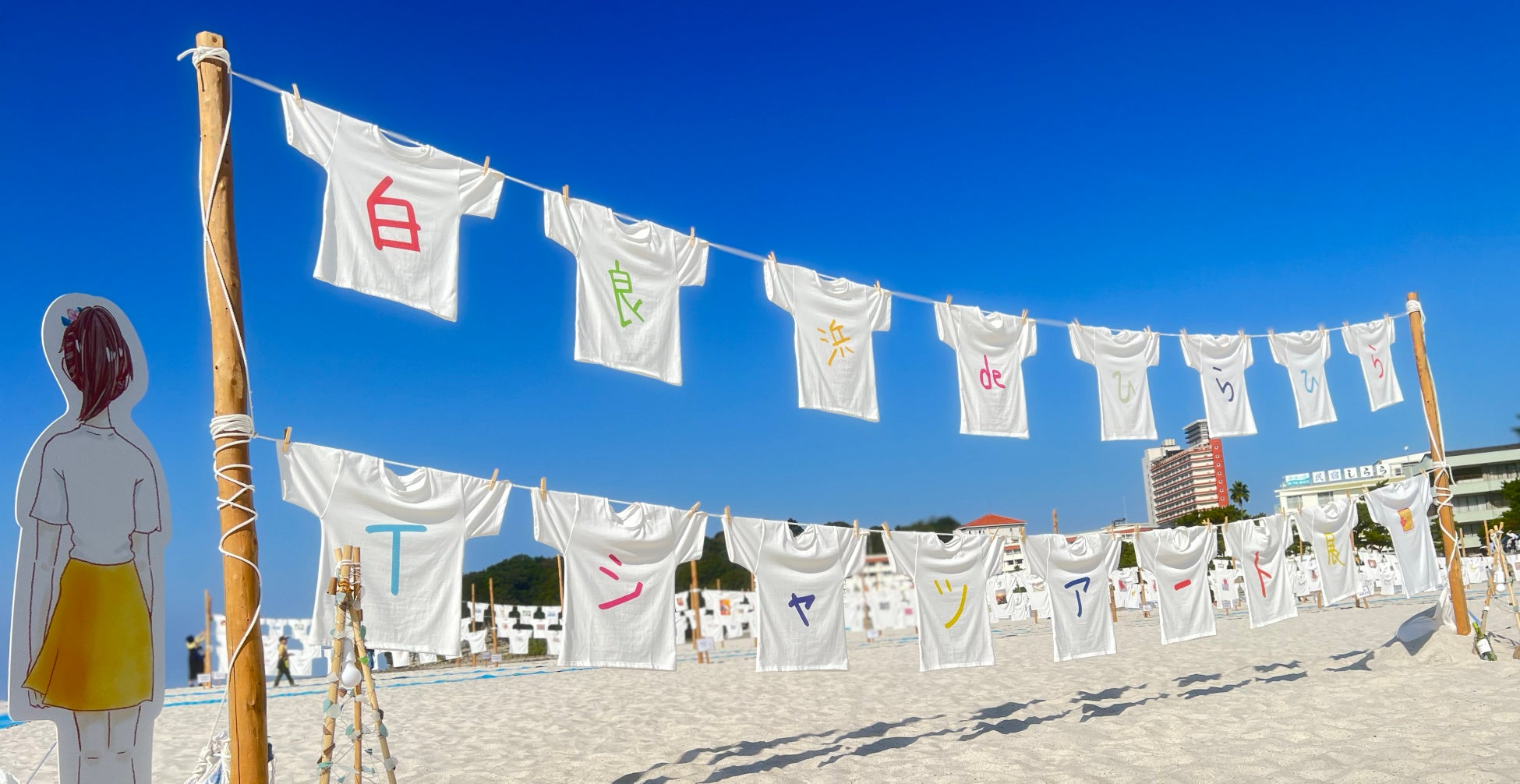 町の観光名所である白良浜の景観を活かし、全国から応募のあった絵や写真をTシャツにプリントし、砂浜に展示。