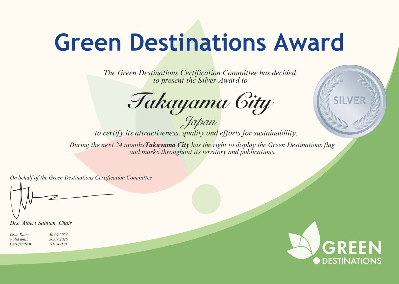 「観光地マネジメント」「自然と景観」「環境と気候」「文化と伝統」「社会福祉」「ビジネスとコミュニケーション」の6テーマ、84項目の基準で書面審査及び現地審査(令和6年9月9日~10日)が実施された結果、高山市は、「環境と気候」「文化と伝統」「社会福祉」「ビジネスとコミュニケーション」分野における取り組みが高く評価され、シルバー認定の基準である70%を超える75%について一定の基準を満たしたことから、シルバーアワードの受賞となりました。