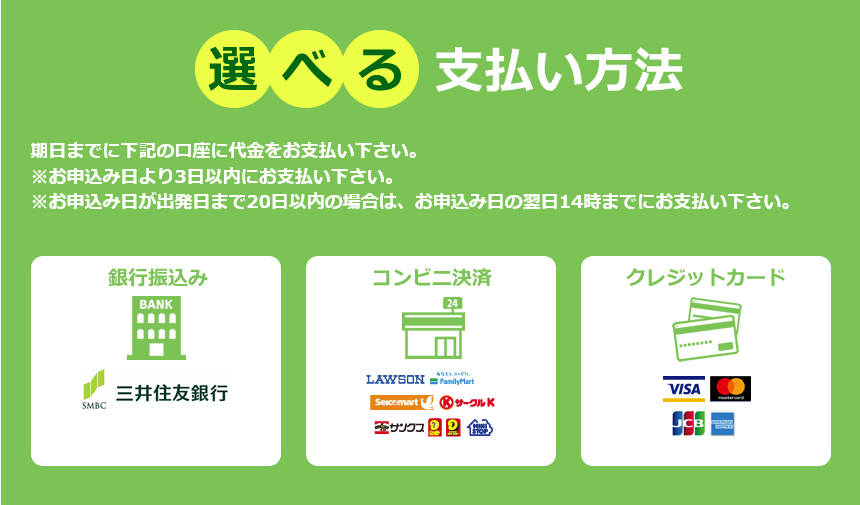 ※お申込み日が出発日まで20日以内の場合は、お申込み日の翌日14時までにお支払い下さい。