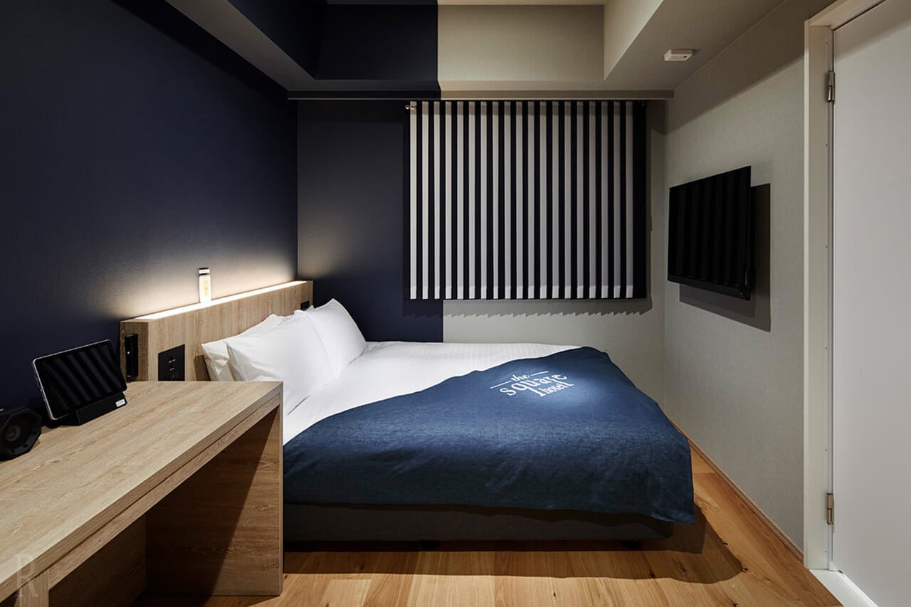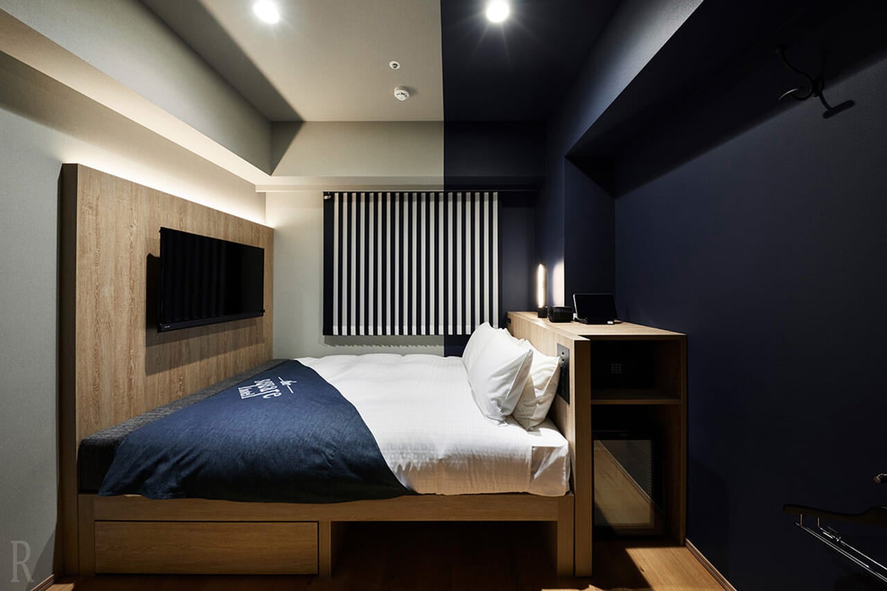 1,600mmのダブルベッドと2名掛けソファを配したコンパクトなお部屋。