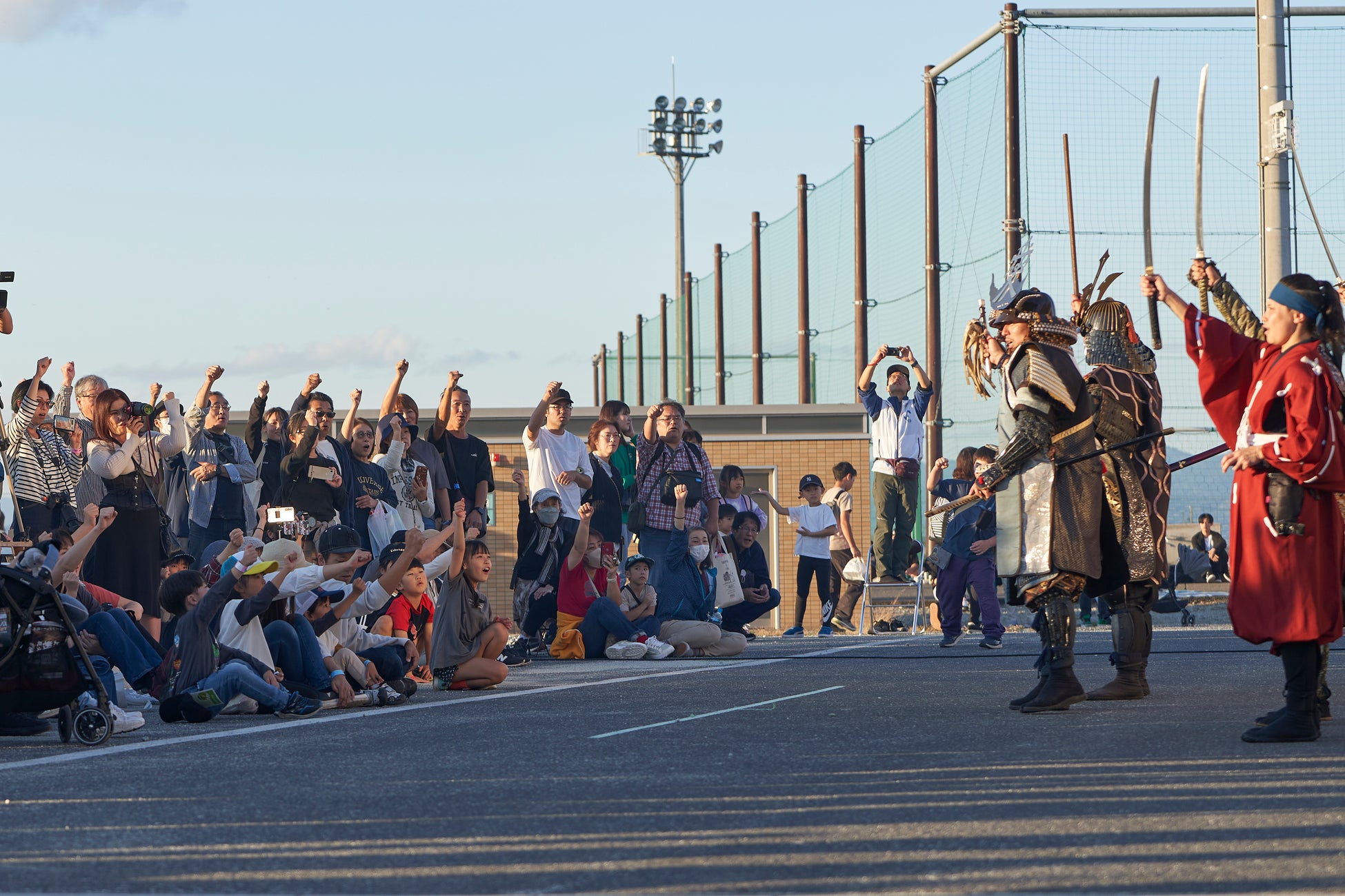 場外特設ステージでは、上杉太鼓、民謡一家パフォーマンスによる演奏、やまがた愛の武将隊によるパレード・ファンサービス、米澤すずめ衆「毘龍」によるすずめ踊り、奥州・仙台おもてなし集団 伊達武将隊のパフォーマンスが行われ、音楽演奏、踊り、演舞に観客も参加しながら、一体感のあるステージイベントが開催されました。